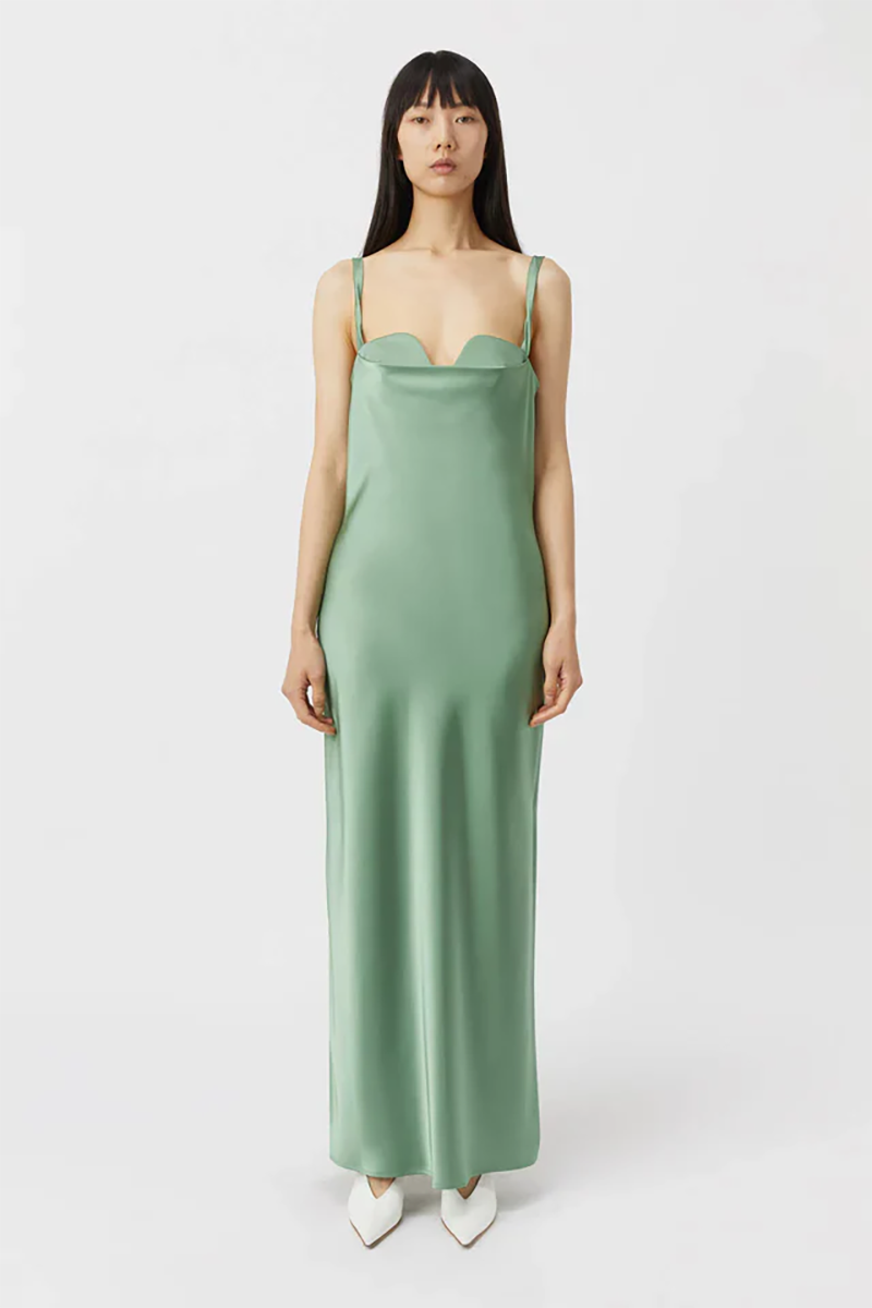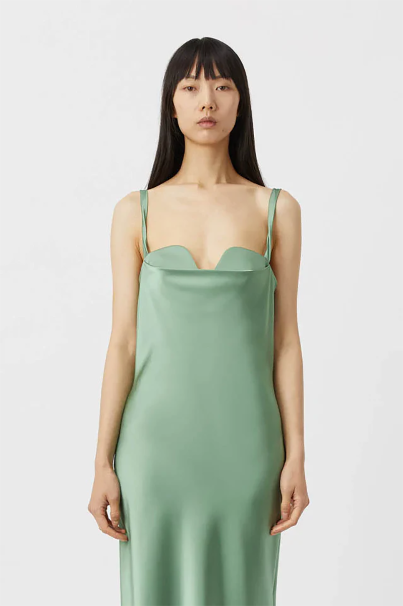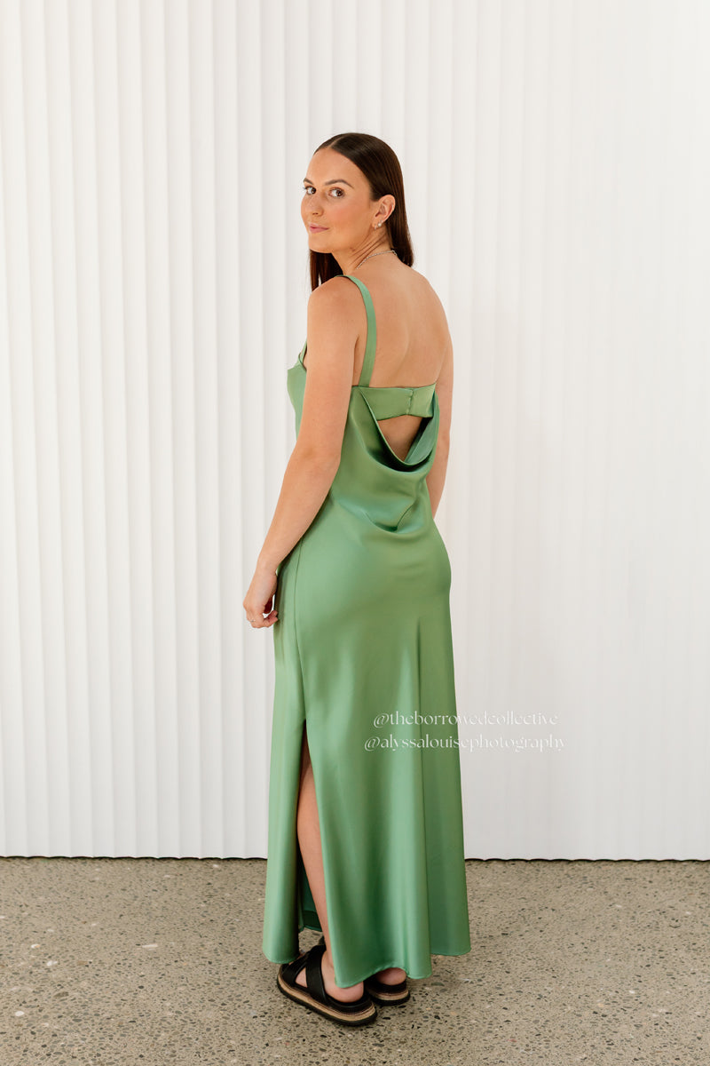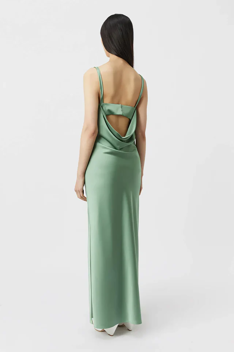 The Aire Slip Dress is a stunning embodiment of elegance, designed to hug the body and gracefully fall from the hip in a stunning eucalyptus shade. Crafted from luxurious satin, it features a sophisticated back cowl and an internal bodice to ensure the perfect fit and support. The side split adds a touch of allure, making it a captivating choice for any special occasion.