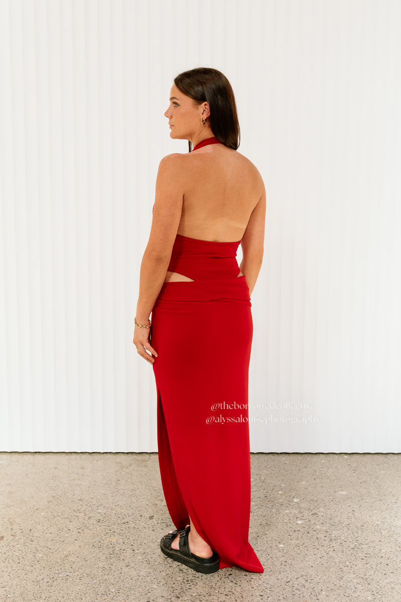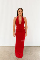 Our Becca Set is a striking ensemble that fuses sleek sophistication with modern edge. The halter‑neck bodysuit sculpts the torso with a straight under‑bust cut, elongated narrow straps, and subtle bust‑gather detailing, while a dipped‑back finish adds an effortlessly elegant, sensual touch. Paired with a floor‑length skirt featuring an asymmetrical waistline, contemporary hip draping and a side leg slit, this set moves with you — perfect for making a statement at a night out, special event or party. Rent the Becca Set when you want bold minimalism and confident allure without the commitment of buying, and step into style for your night out