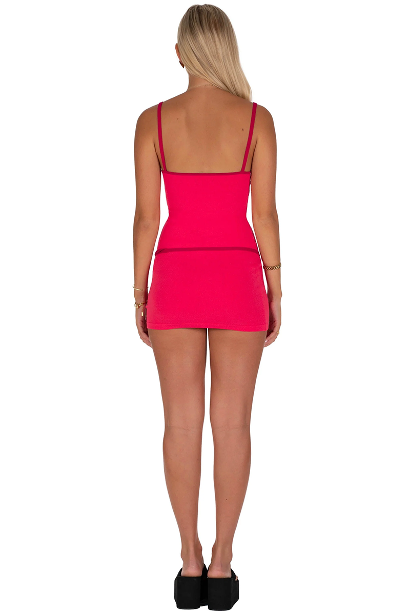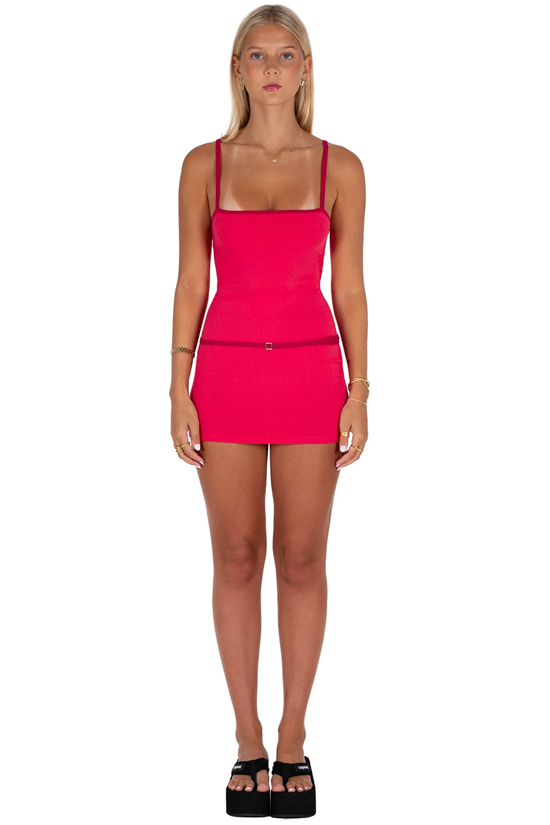 Turn heads in the Belle Mini Dress in Cherry, a sultry yet sophisticated piece designed to hug your curves in all the right places. Crafted from premium knit fabric with a generous stretch, this body-hugging mini offers both comfort and allure. The rich red hue is elegantly accented with burgundy contrast trim, adding a refined touch to its sleek silhouette.