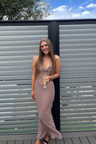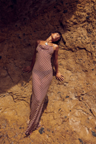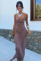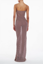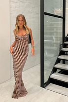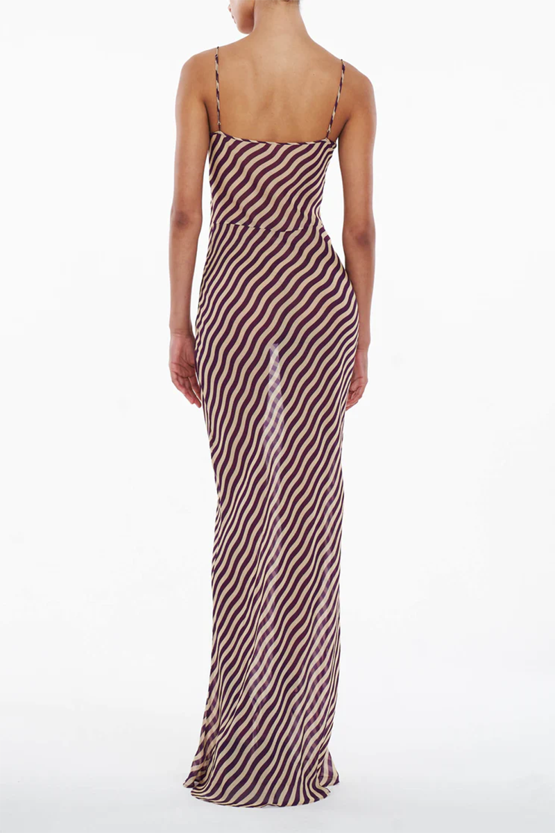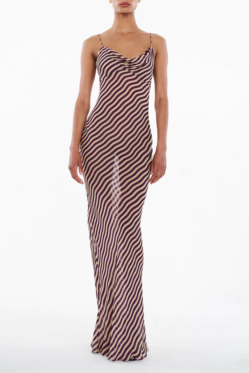 An effortlessly cool modern classic you'll want to wear forever, the 90s-inspired Assisi dress is as flawless as it is flattering. Crafted from a daringly sheer georgette, it's printed with striking waves in a rich dark purple and elevated with a double cowl neckline and delicate straps. The translucent stripes create an enticing visual effect, leaving a subtle hint of skin while maintaining an air of elegance.