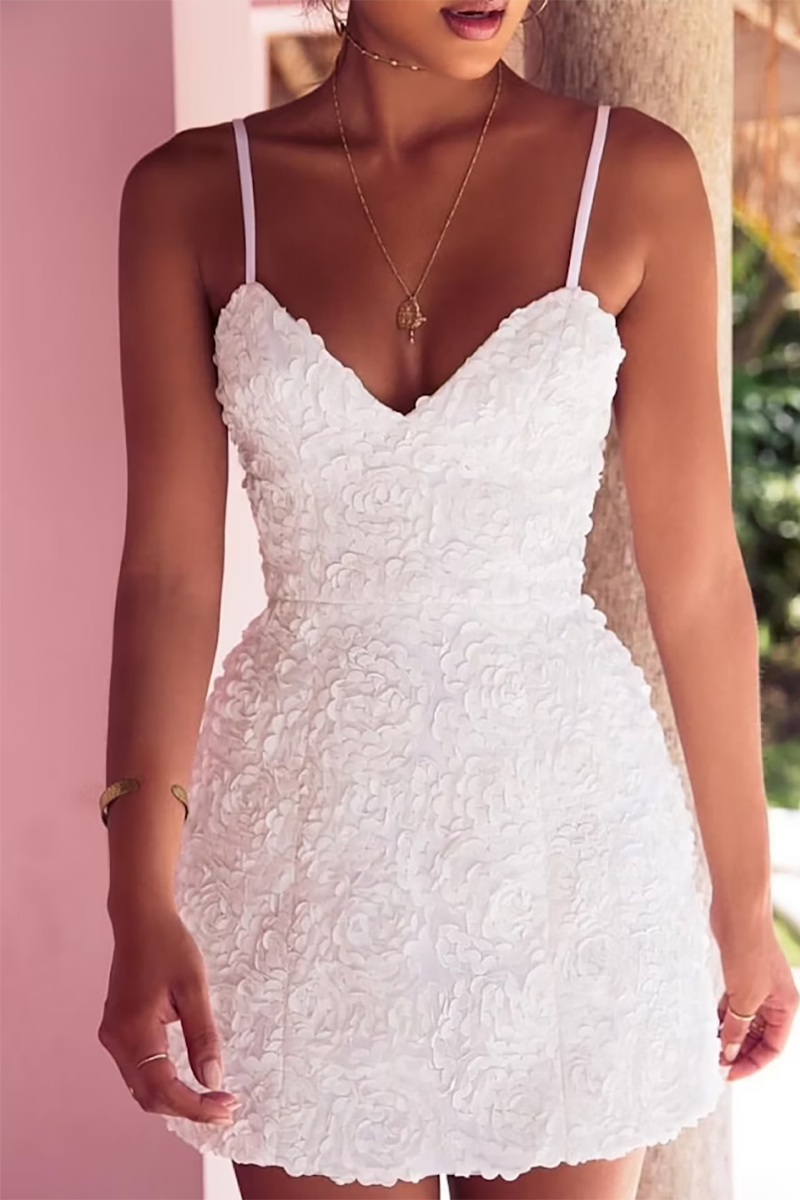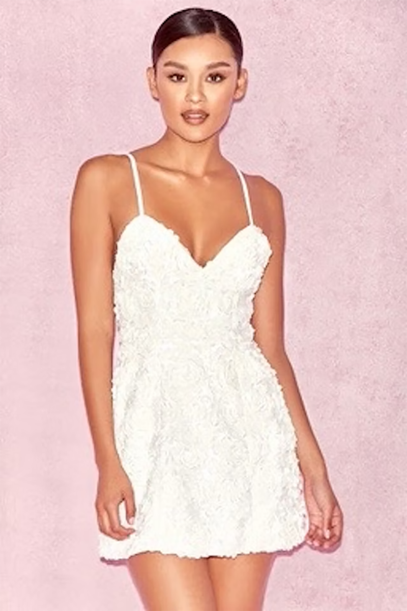 The House of CB 'Desiree' White Appliqué Floral Mini Dress is a stunning statement piece that exudes elegance and femininity. Designed with a delicate floral appliqué, it features a flattering bralet-style bodice, a cinched waist, and a beautifully draped tulip-shaped skirt that enhances your silhouette. The adjustable spaghetti straps ensure a perfect fit, while the back zipper allows for effortless wear. Adding both charm and practicality, this dress also includes hidden pockets. Perfect for bridal events, summer parties, or any special occasion, it pairs effortlessly with white sandals for a chic and sophisticated monochrome look.