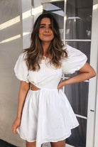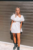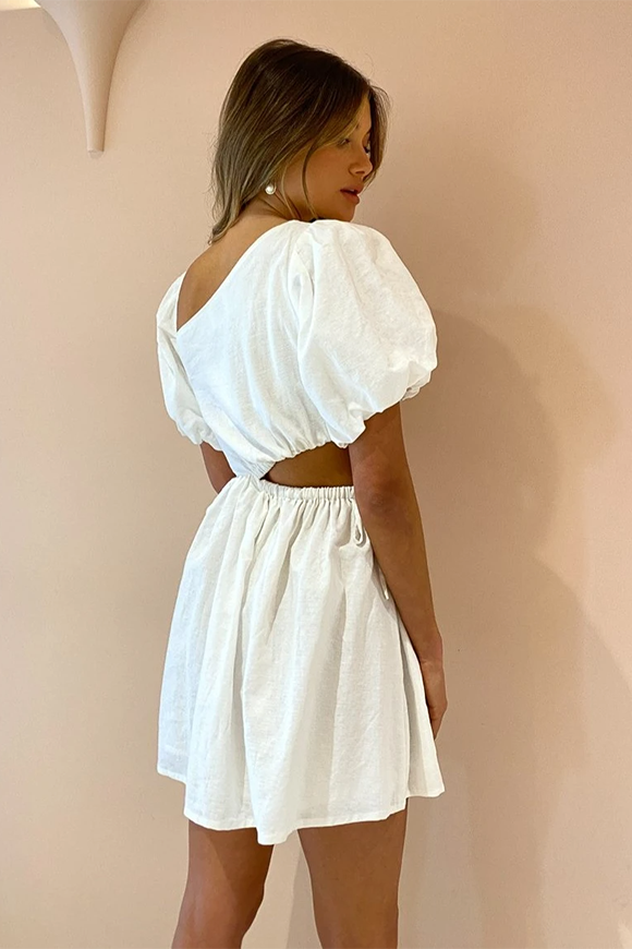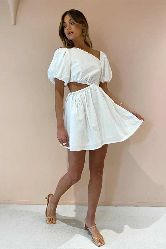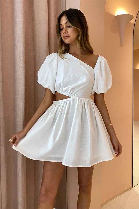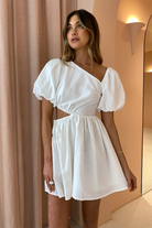 Our Gabriella Asymmetrical Mini dress is the little white number you've been looking for. With a contemporary and flattering asymmetrical neckline, the Gabriella features bubble sleeves and a soft mini skirt - making it a perfect transitional piece to take you from day to night. The cut-out waist detailing adds a touch of femininity and makes this one of our favourites for weekend brunch with the girls.