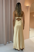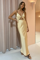 Our Hazel Maxi Dress from Bec & Bridge provides a signature silhouette in a gorgeous wheat tone that's perfect for your cocktail wardrobe. Cut from a luxuriously slinky fabrication with a plunging v-neckline, under bust cut-out and signature twisted bust, this bias cut maxi dress skims and flatters in all the right ways. With the contemporary contrast stitching, sleek silhouette and cut out at back, this maxi is perfect to rent for engagement festivities and formal soirees.