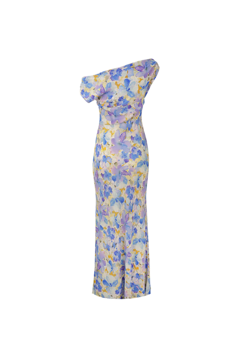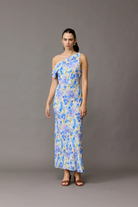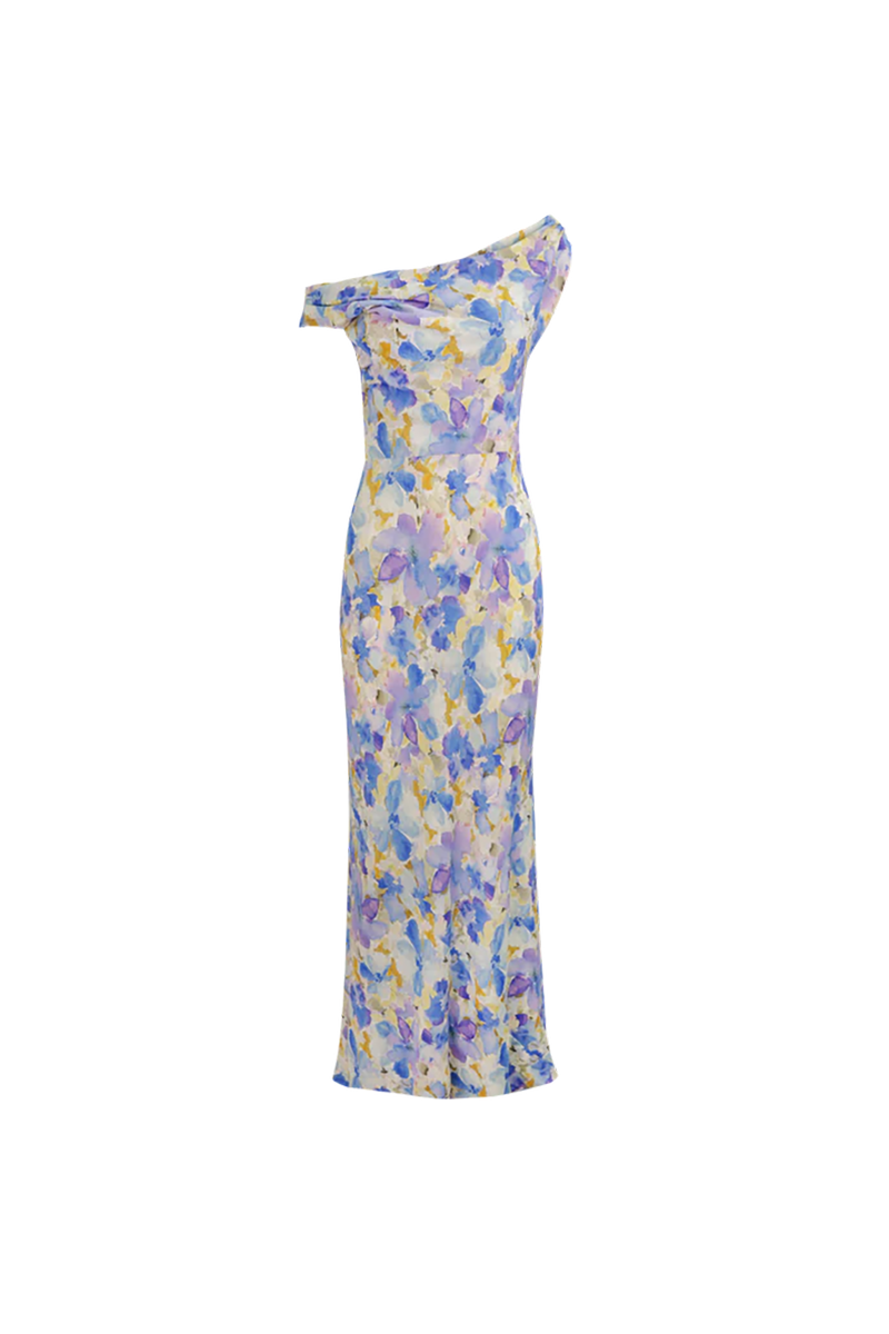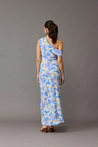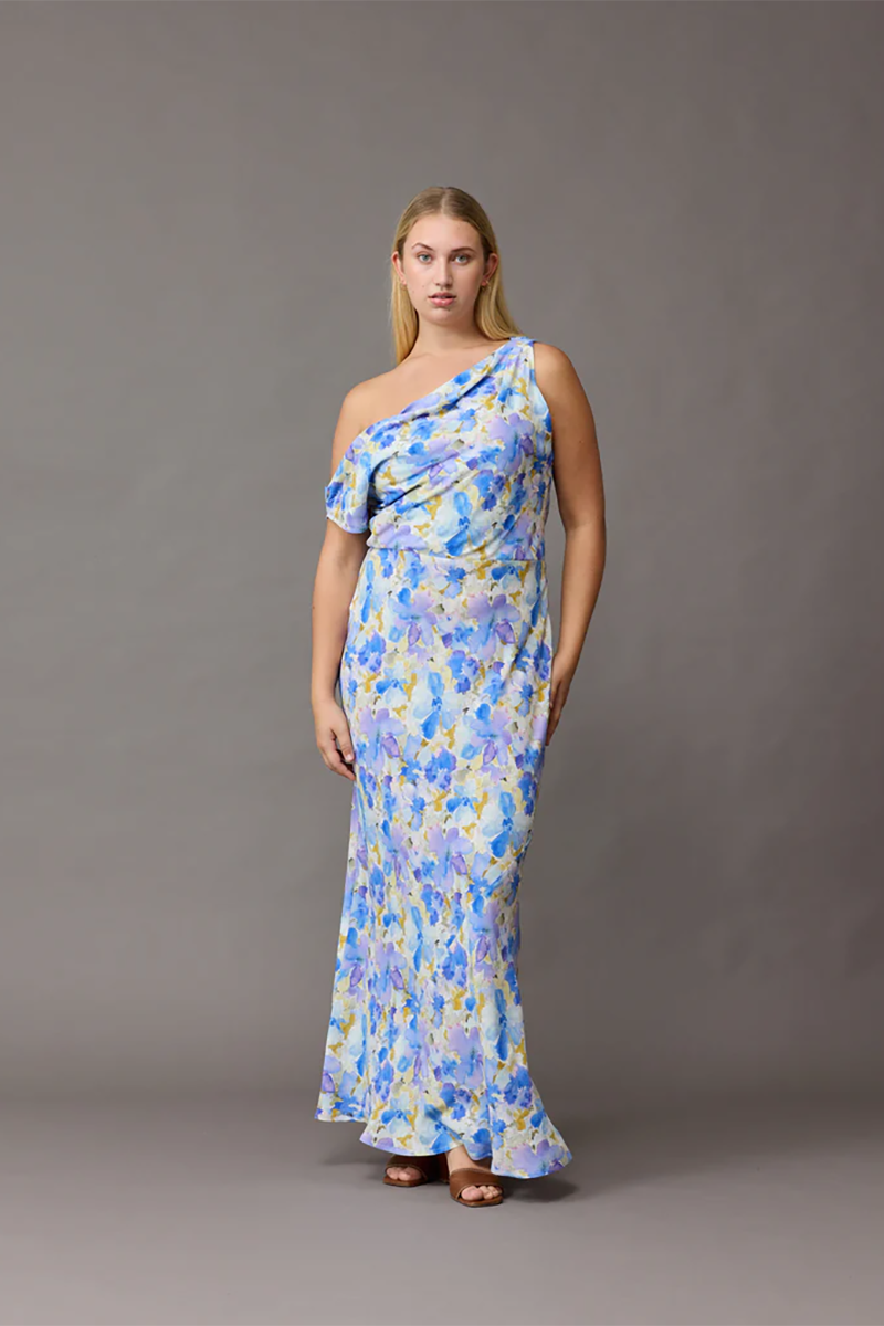 The Melon Maxi slip dress features a cowl neckline and can be worn on the shoulder or off. With a gorgeous blueberry floral print, this Ruby number is perfect for weddings and celebrations.
