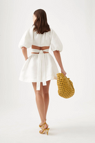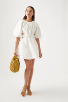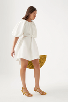 In a classic Aje silhouette, the Mimosa Cut Out Mini is perfect to hire for cocktail evenings and special occasions. Featuring puff sleeves, waist cut outs, a self tie belt and side seam pockets, this mini has a lightweight, floaty silhouette.