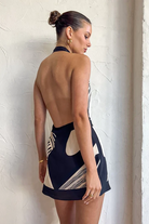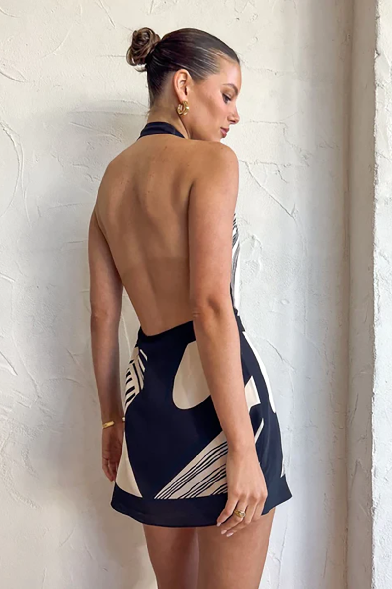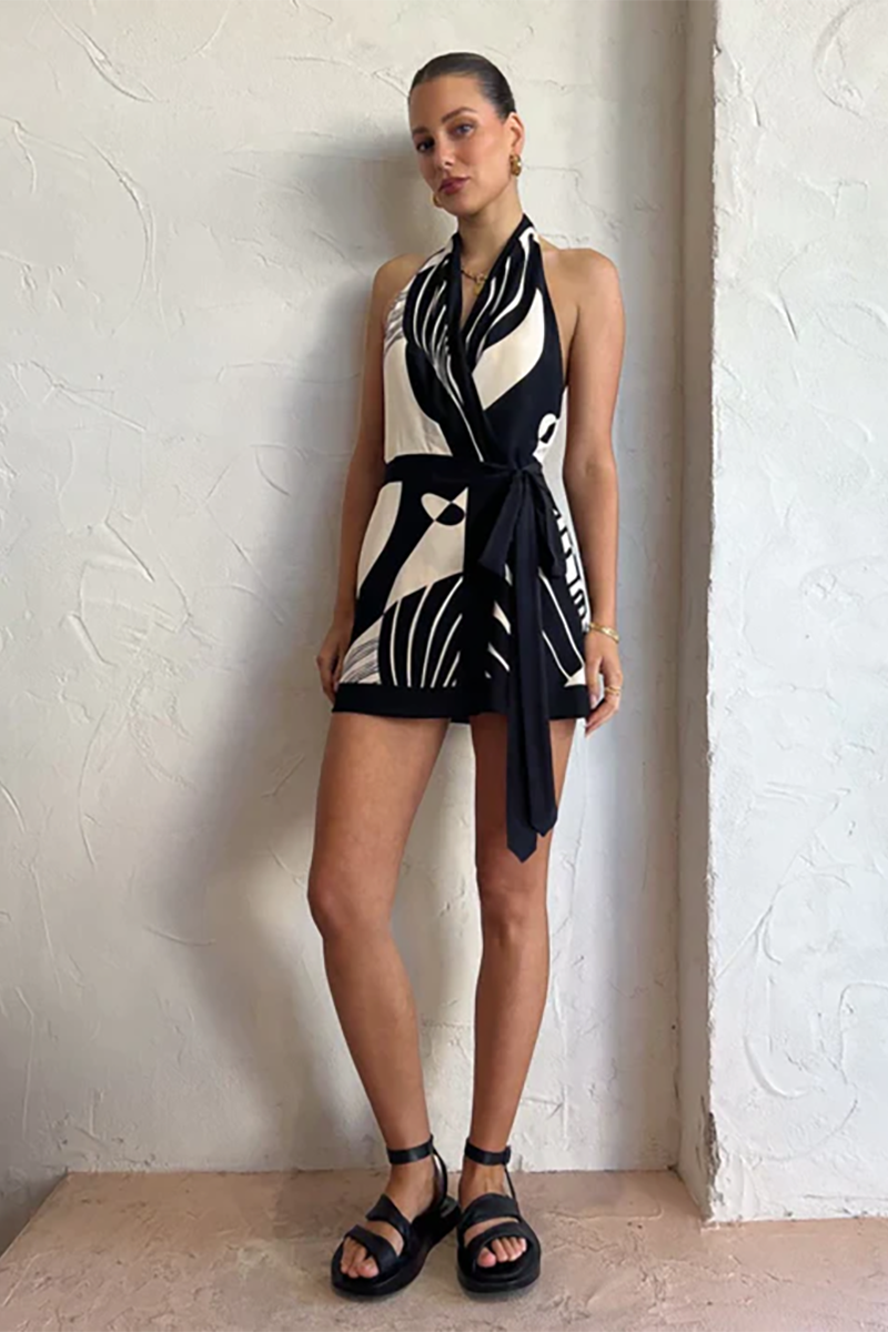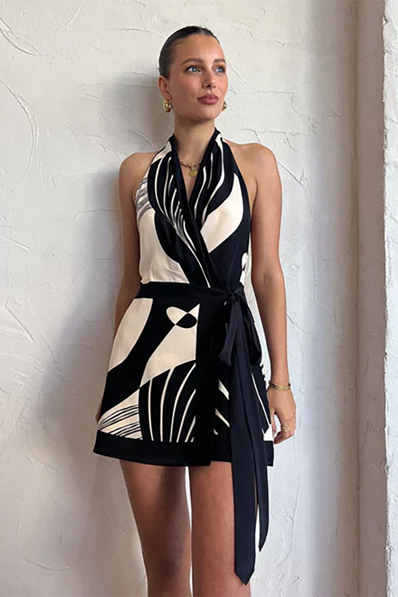 The Realisme Wrap Halter Mini is a modern shape, crafted from a naturally sourced silk crepe in the Papier print. The perfect dress rental for summer evenings that can be easily dressed up or down. Featuring a draped silhouette with a wrapped waist and an open back detail. Designed to be worn as both a mini dress or over a pant.