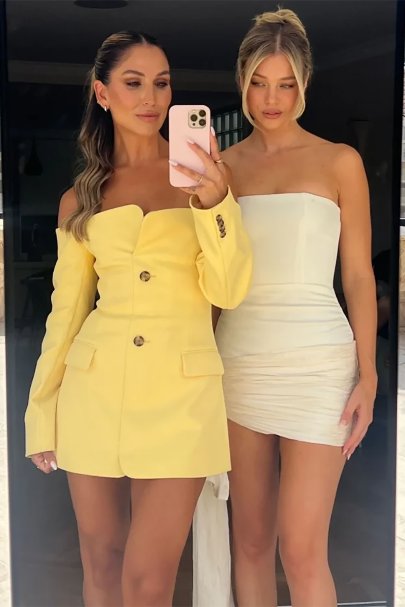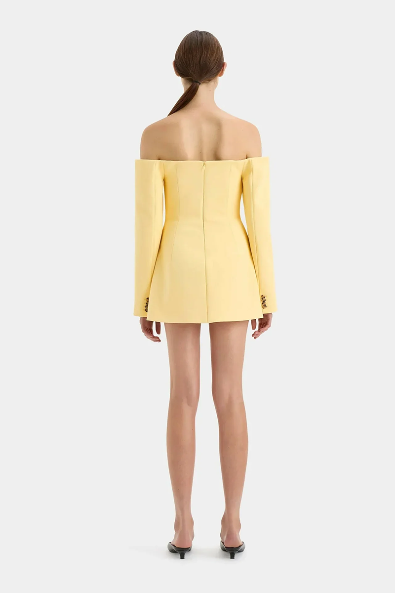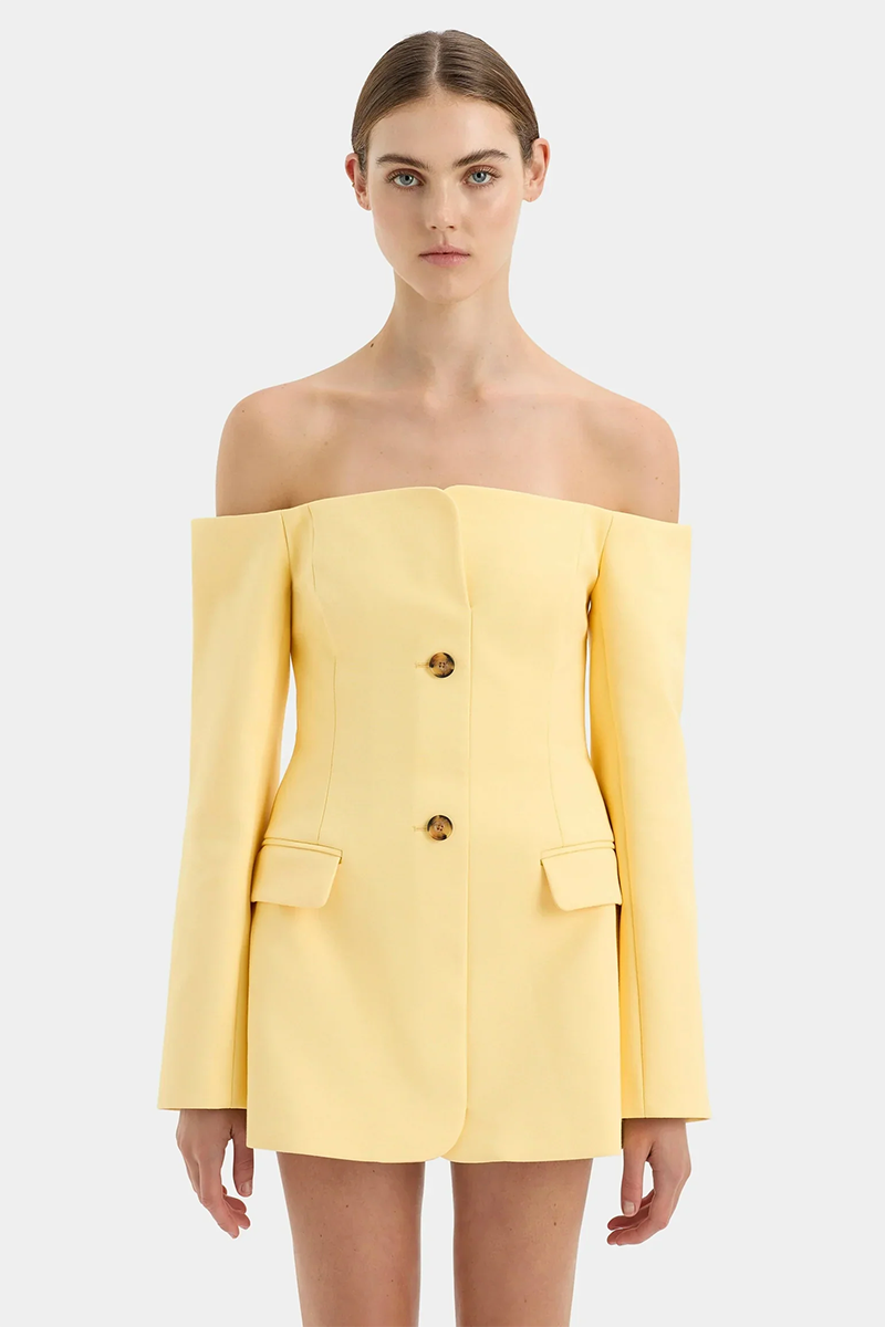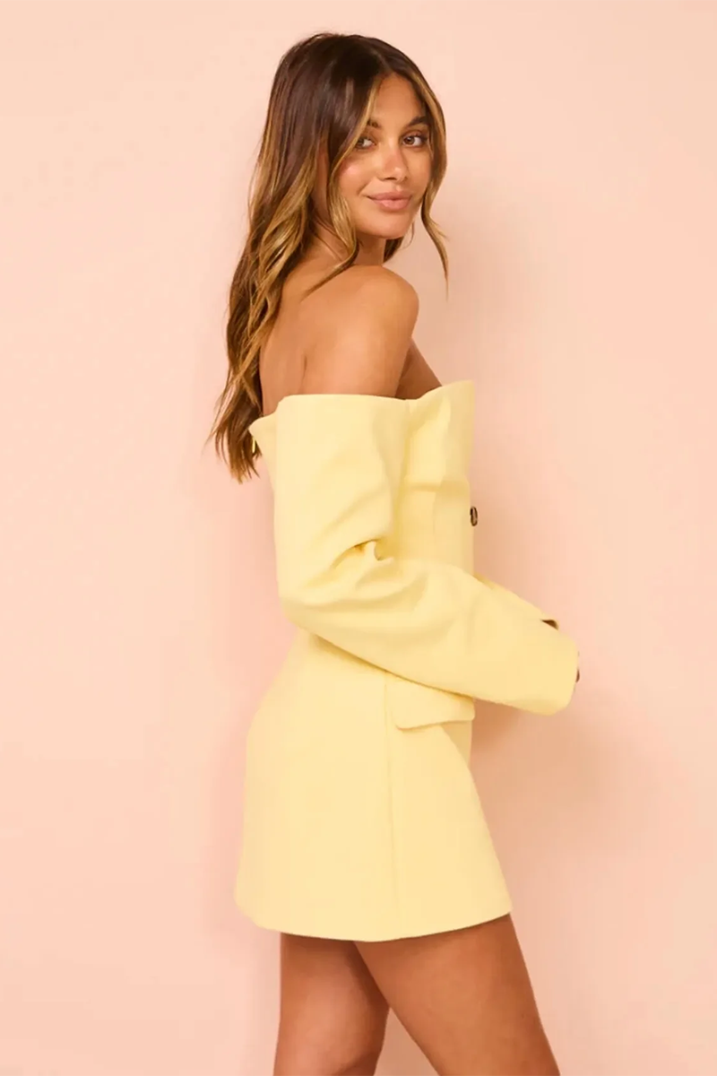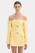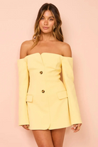 The Sandrine Tailored Mini Dress is a modern dress, crafted from a premium Italian suiting fabric. Inspired by the shape of a blazer, this style offers an off-shoulder fit with a single breasted design, punctuated waist, and front welt pockets. Featuring an internal corset to provide a structured look, pair your dress hire with heels for your next occasion.