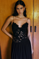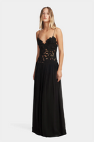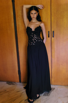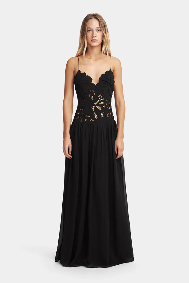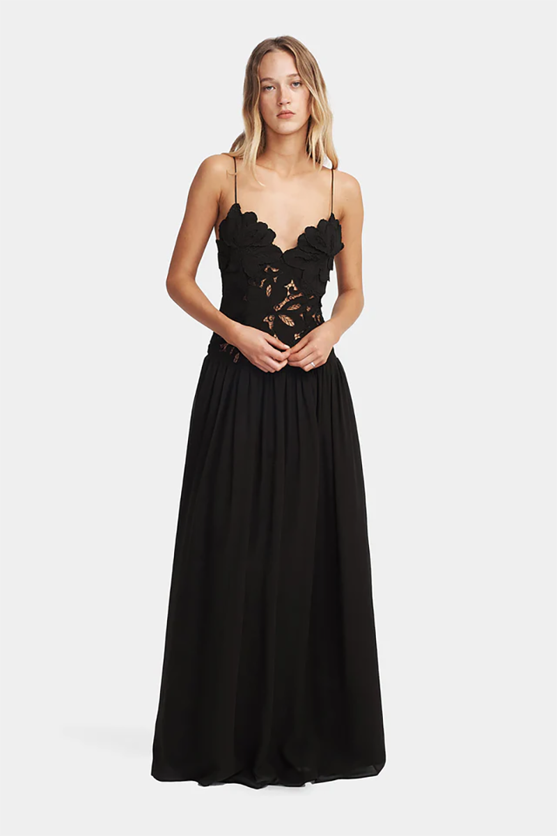 The Stephanie Maxi Dress is a maxi length dress with a sheer lace waist detailing and lined bust cups that falls into a gathered, full skirt. The dress has roleau straps with length extension for the perfect fit. The Stephanie is the perfect piece for your next special event. The Stephanie Dress is hand-stitched and crafted from a delicate fabric.