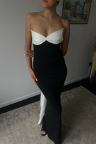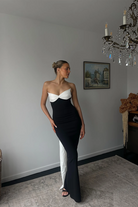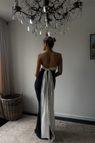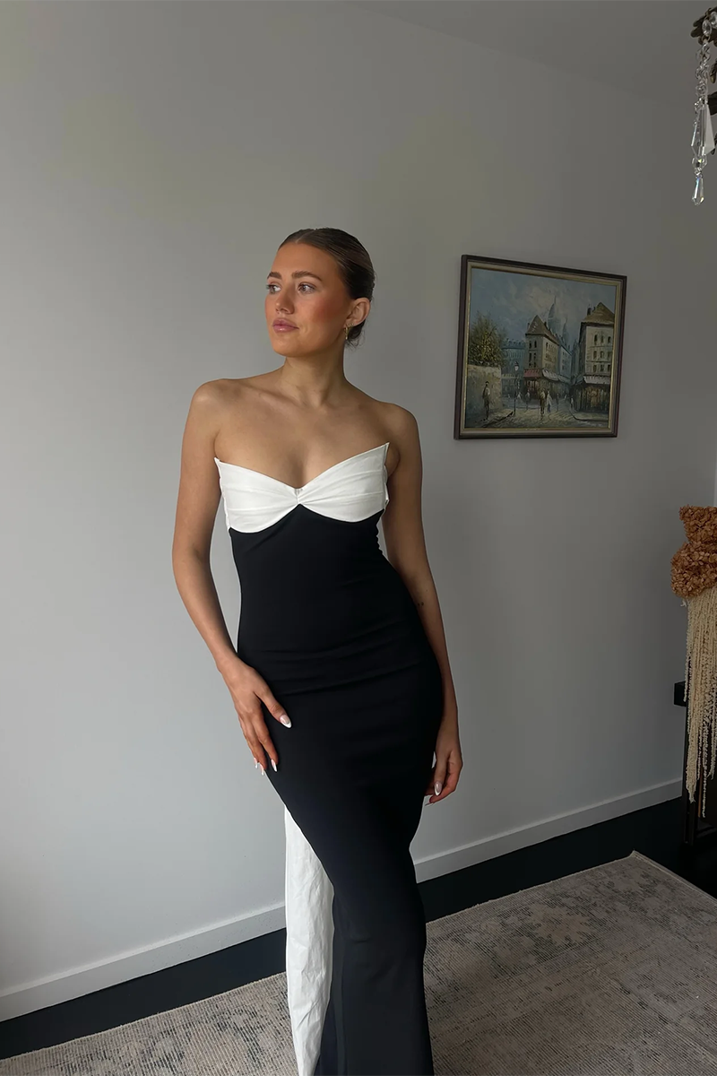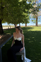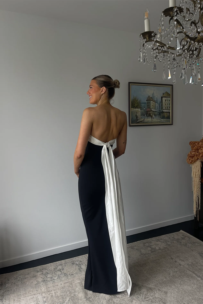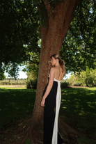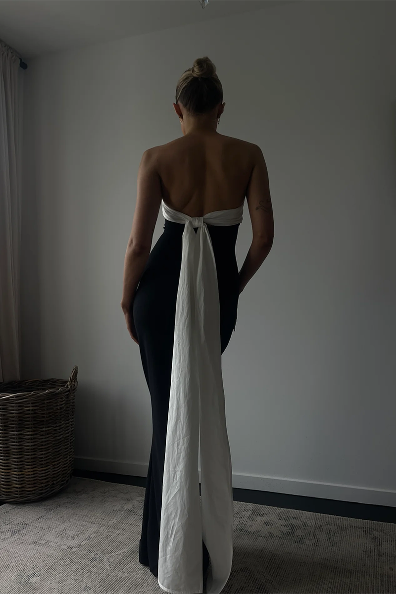 The Blair Dress is an elegant two-tone dress featuring a fitted silhouette. The bodice is strapless, with a structured detail that contrasts with its sleek black body. The full length design is accented by a tie up back panel which drapes to the floor. It is 100% designed and handmade in Melbourne.