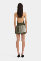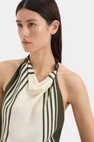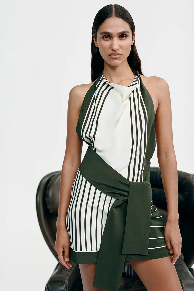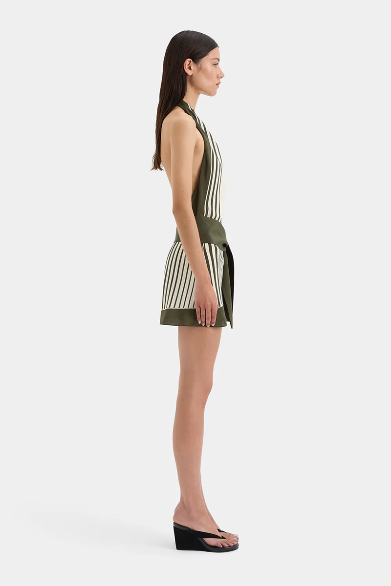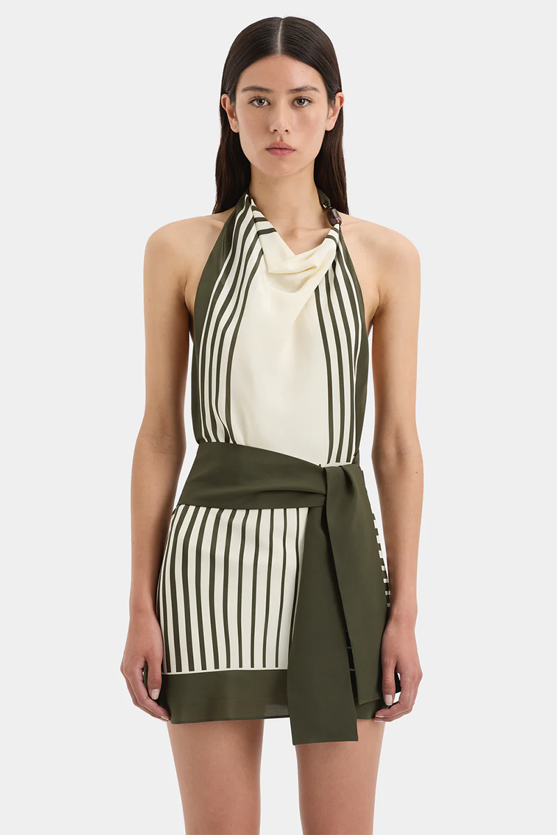 The Leilana Mini Dress is crafted from lightweight silk crepe de chine in the SIR exclusive Garden Stripe print. Designed for a soft drape through the body, it features an open back, removable waist tie and a high cowl neckline adorned with a cluster of beads.