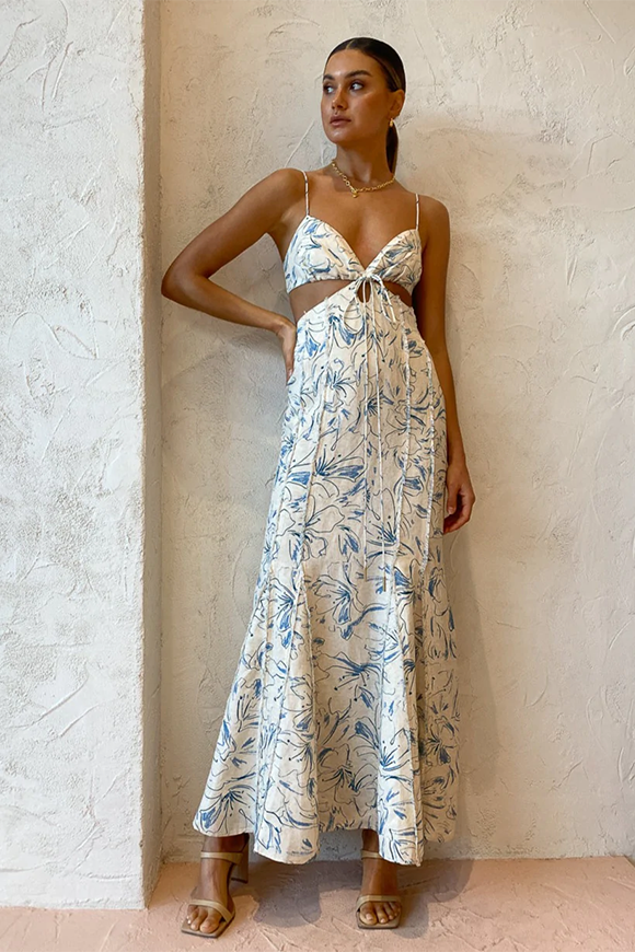 Our Anica Dress features a stunning floral hibiscus print on a neutral background, crafted from a linen blend. This signature midi features a bralette style bodice with adjustable rouleau straps, a front tie feature and complementing waist cutouts. Flattering the waist before falling into a mermaid inspired hem, the Anica's raw edge panel details makes it one of our favourites for romantic dinner dates by the sea and garden party soirees.