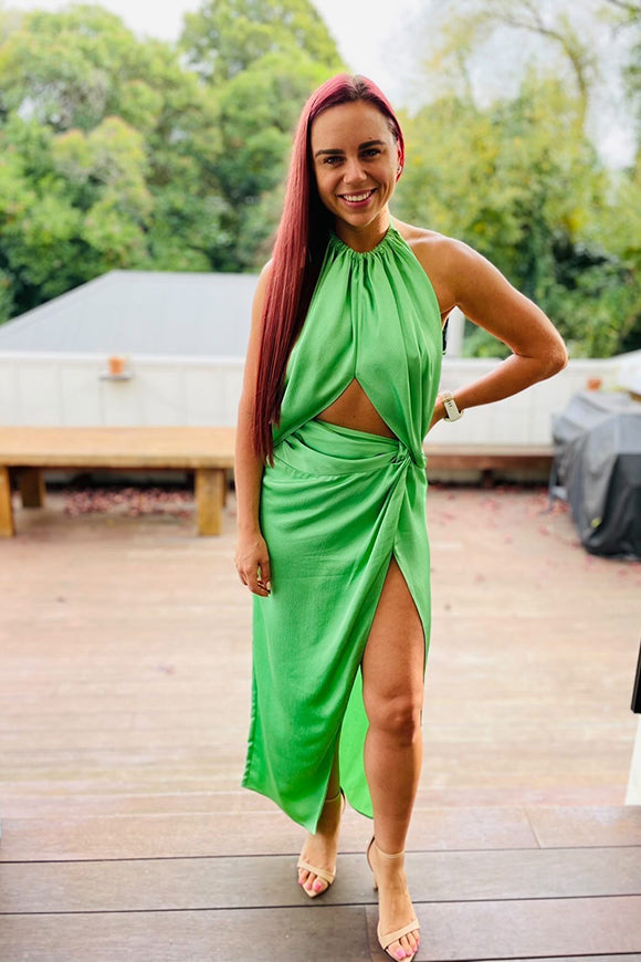 The Elyse dress is designed to skim and flatter the female form in a gorgeous apple green shade. Crafted from silk-like satin fabrication, this midi features a draped halter-neck bodice, daring waist cut-outs and a sarong-like skirt. With a leg split to accentuate and elongate the leg, this dress is perfect to rent for cocktail hour, birthday celebrations and weddings.