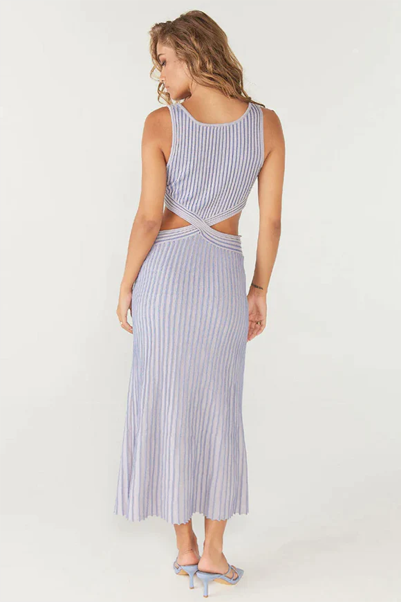 The Glory Knit dress is a soft touch midi crafted from ribbed knit fabrication. With a v neckline and wrap around bodice, this striped number is easy to dress up with heels or down with your favourite pair of sneakers. The crossover detailing at the waist and side cut outs create a stunning silhouette to rent, while the high leg split offers ease of movement and comfort.