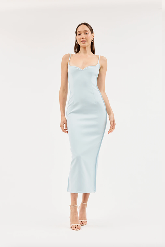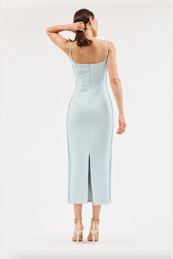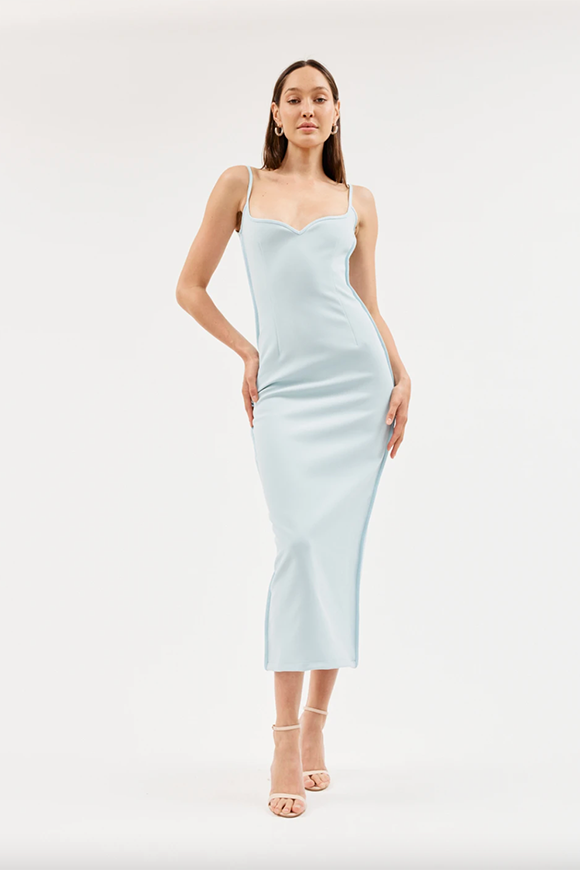 Our heart mineral blue dress features a classic cult silhouette that's figure hugging to embrace all your gorgeous curves. Made from an exclusive pastel blue with vegan leather trim detailing, this Paris Georgia number is sure to be a showstopping dress for your next event.