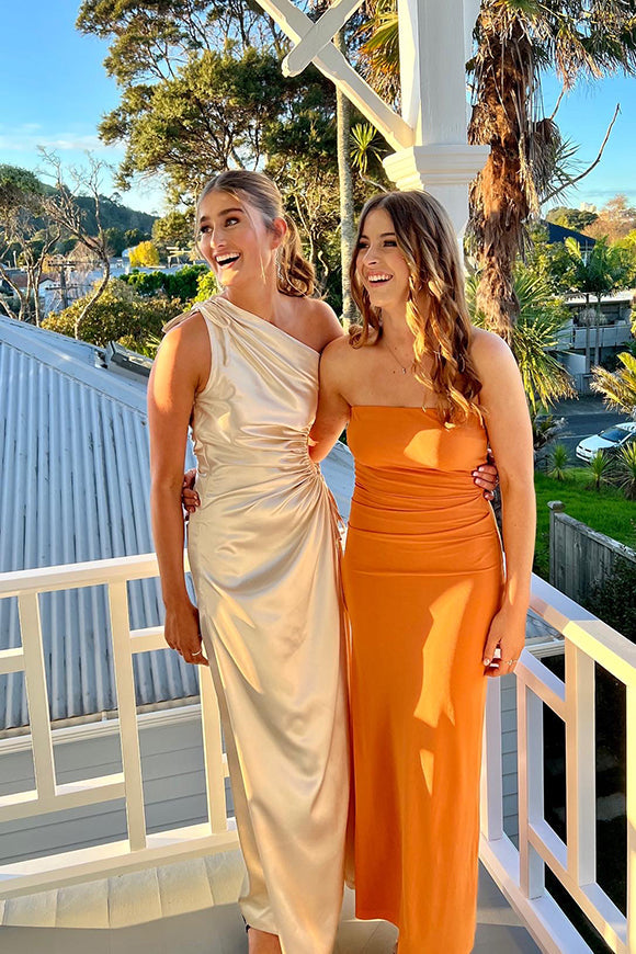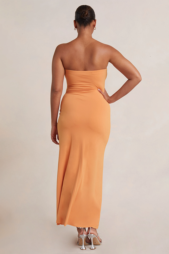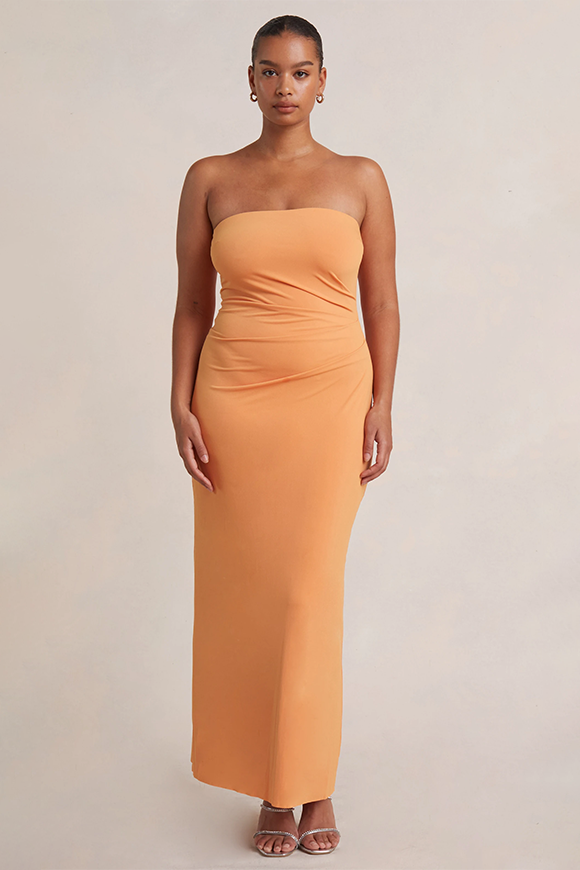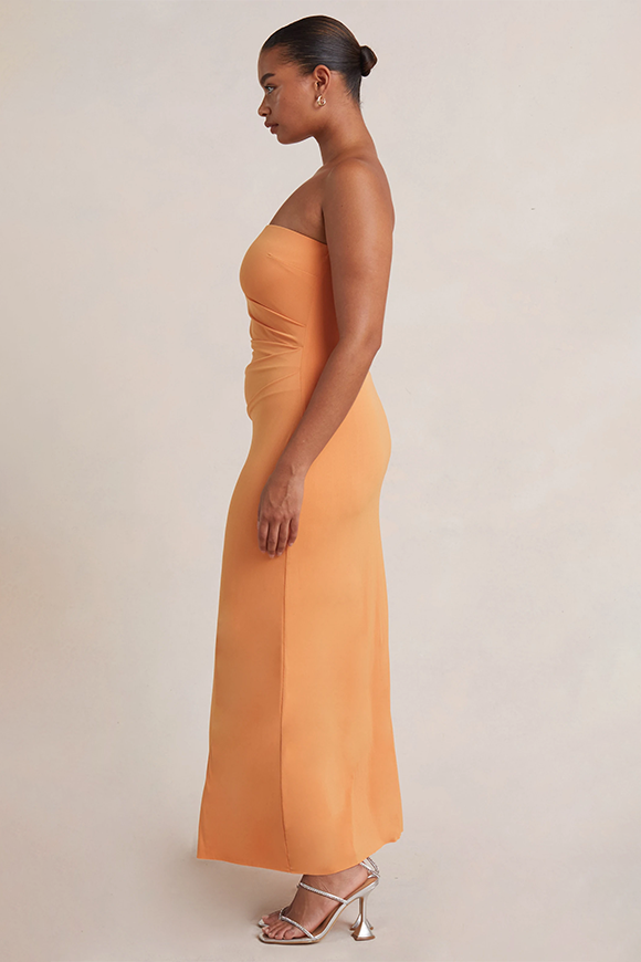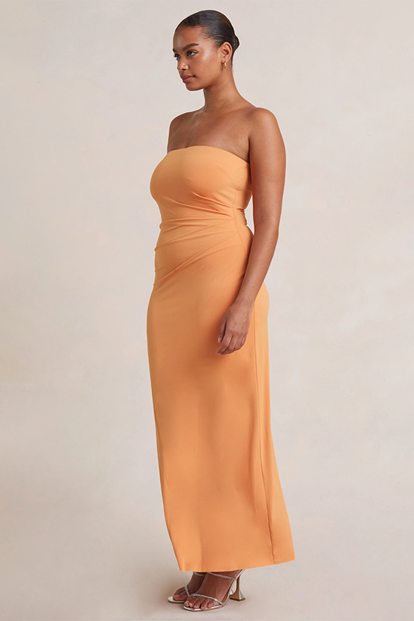 An effortless and easy-to-wear style, the Myla Strapless Dress is cut from our signature liquid crepe fabric that cinches in the body and skims the silhouette. The bandeau maxi dress features side tuck detailing that compliments the figure. The Myla is perfect for ball season or for your 21st!