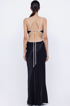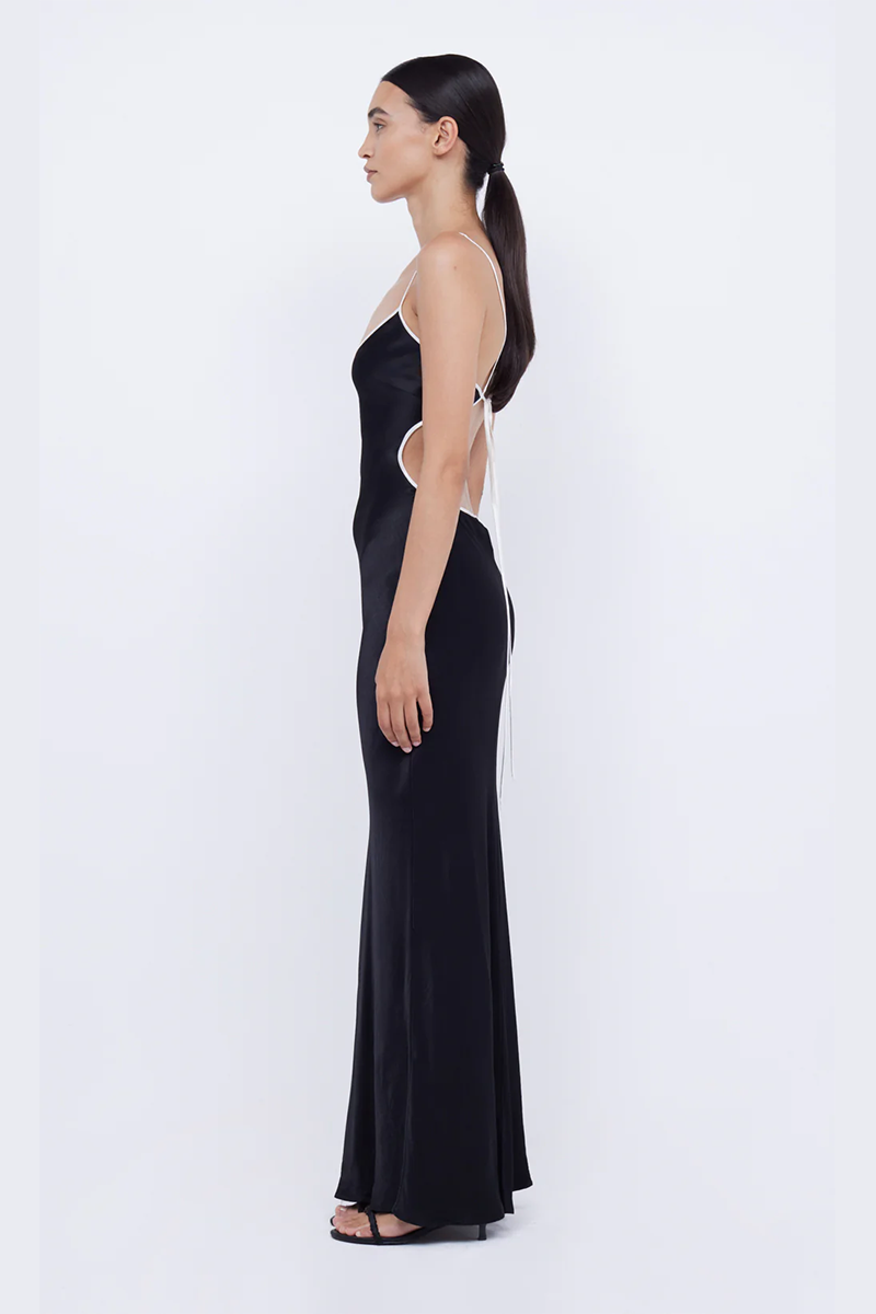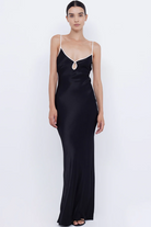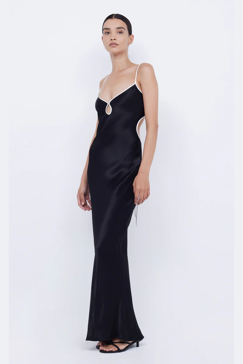 A bestselling design, the BEC + BRIDGE Cedar City Maxi Dress is a slinky V-neck style with a keyhole cut-out detail and contrast binding that carries through straps to tie-back. The bias-cut maxi is finished with a rolled hem, and an adjustable knotted strap which can be loosened and tied at desired length.
