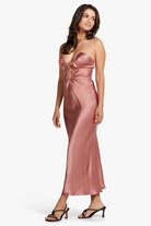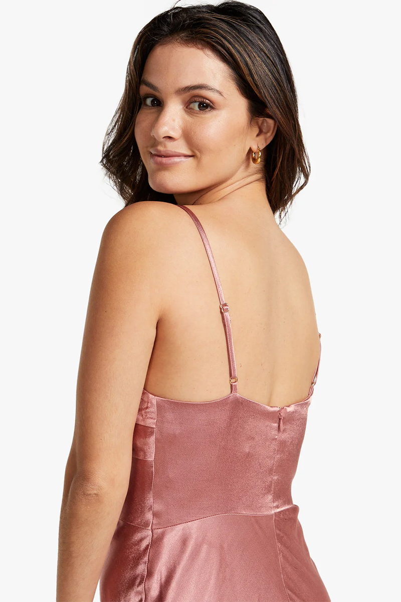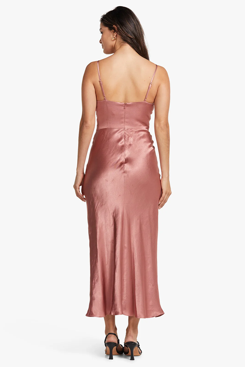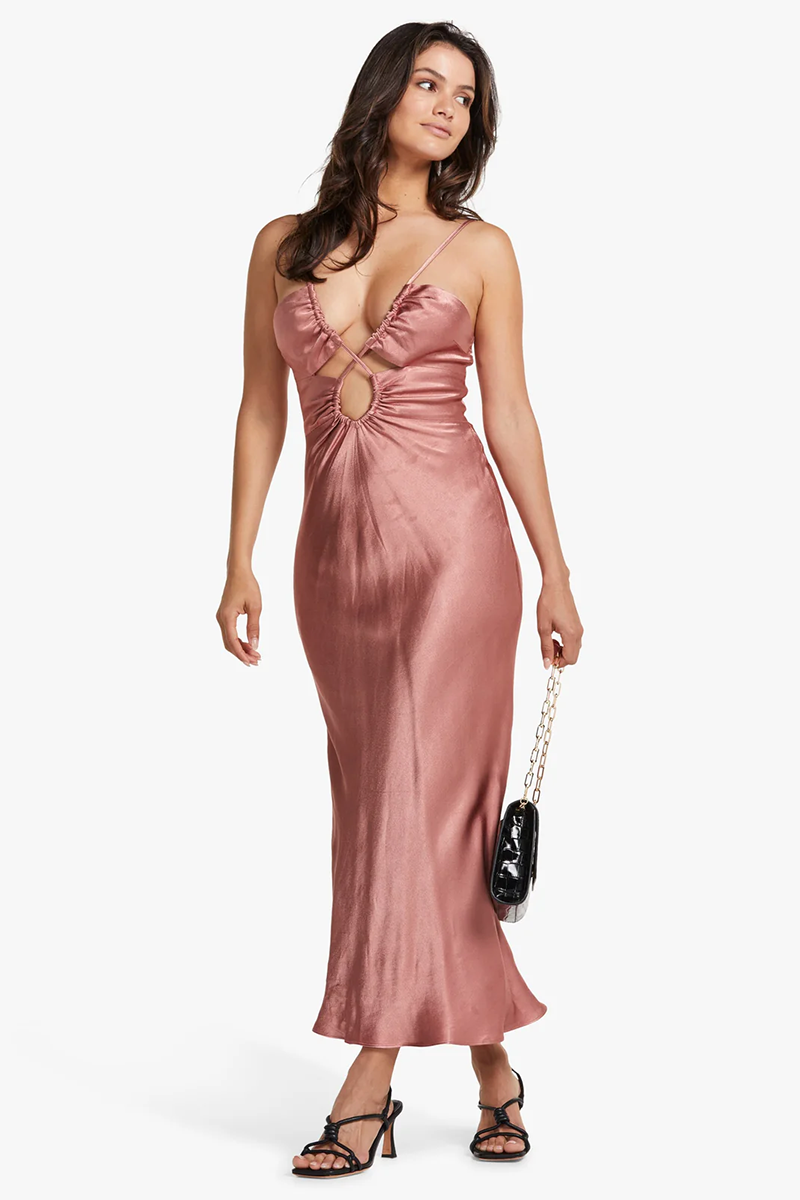Sure to be this season’s ‘it’ dress - Shona Joy brings us a silk number sure to impress. A gorgeous laced keyhole neckline bring an ethereal vibe to this delicate midi. Adjustable angled rouleau straps and luxurious sheen cut on the bias truely make this piece one-of-a-kind. Destined to be your new event-wear staple and new favourite pink rental.