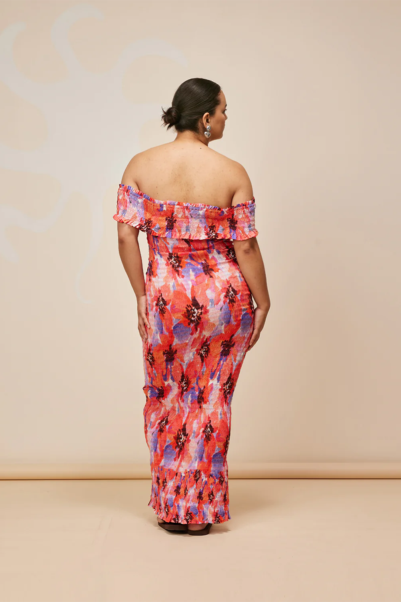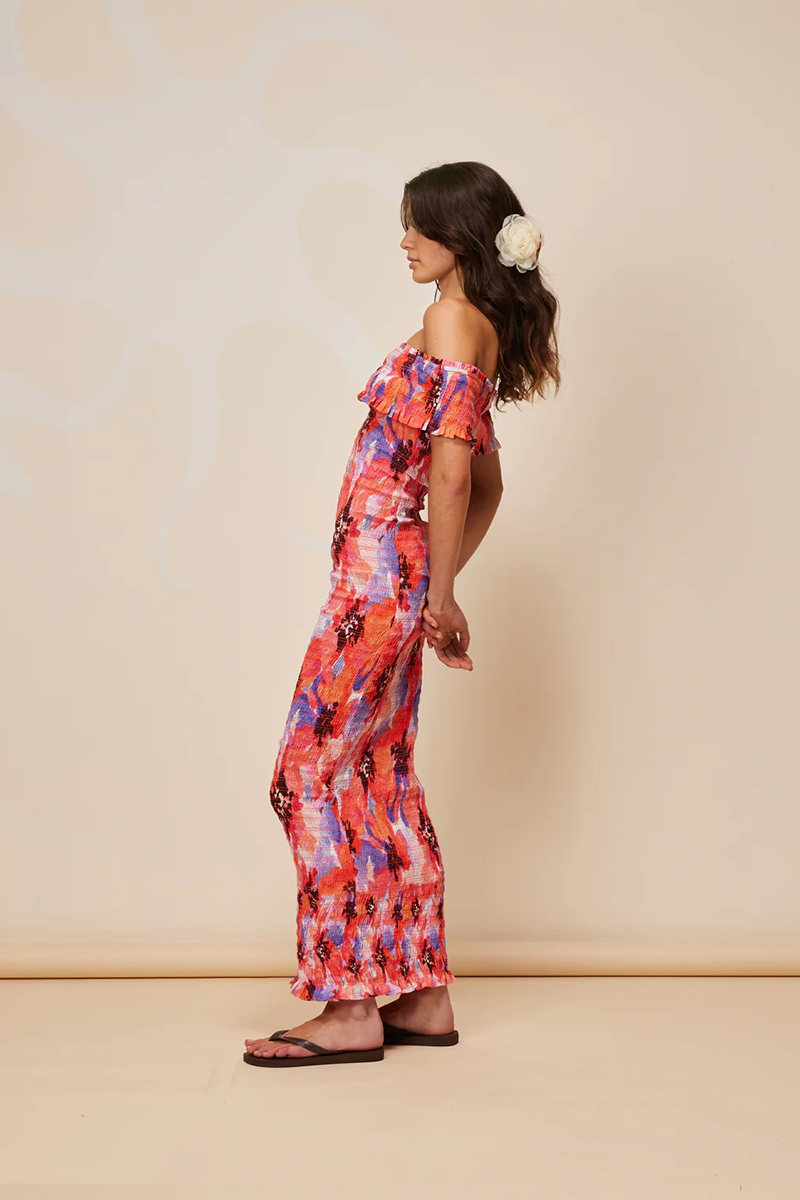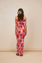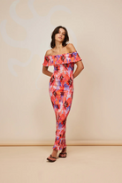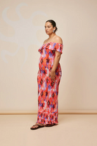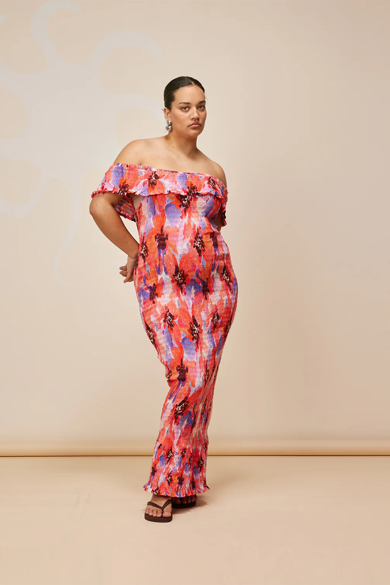 Our gorgeous Ruby Jaquetta dress is an off-shoulder shirred cotton maxi dress designed in a vibrant poppy floral print. This dress is a win-win situation, look seriously good whilst being seriously comfy in the shirred, stretch cotton. With its bold print and scarlet shades, this rental is one of our Summer wedding favourites.
