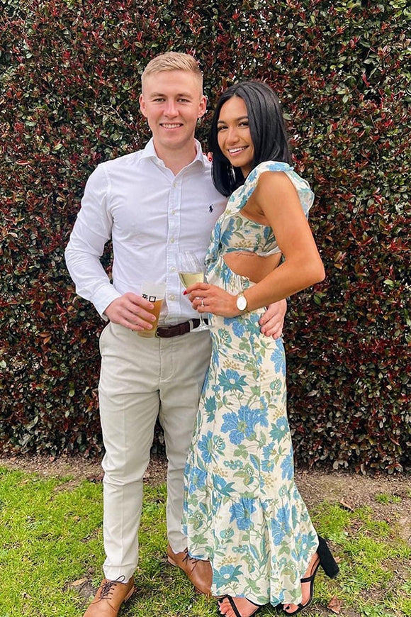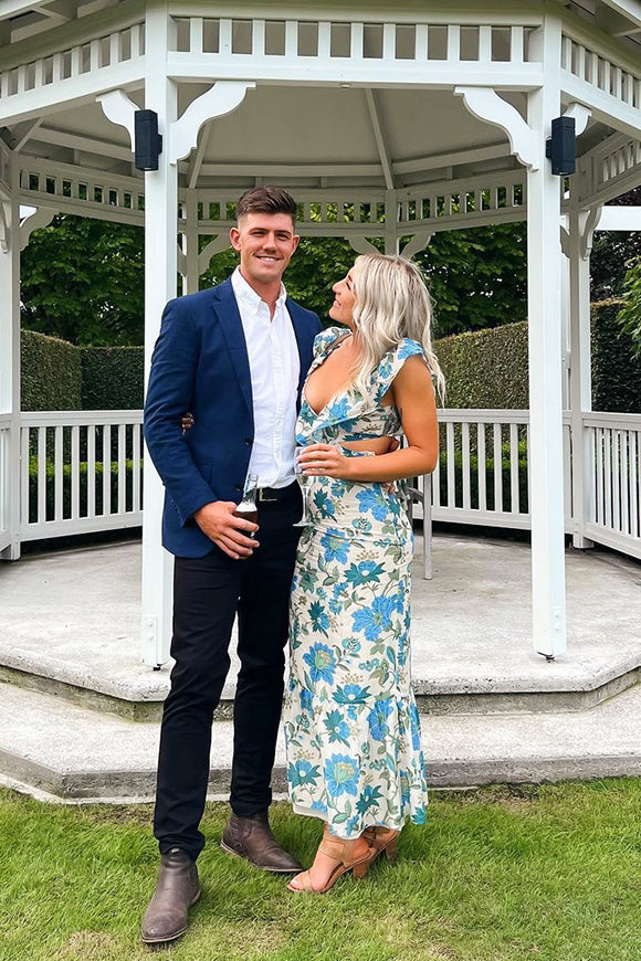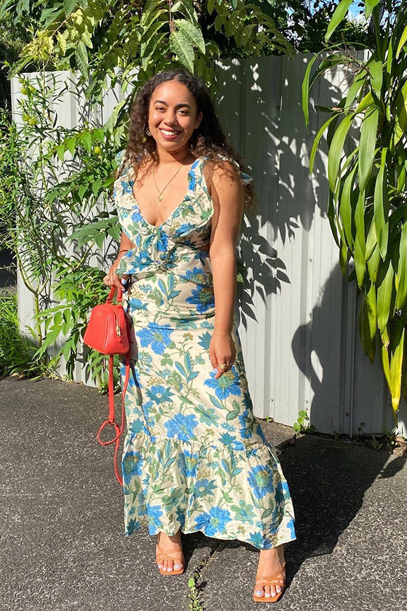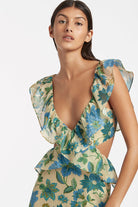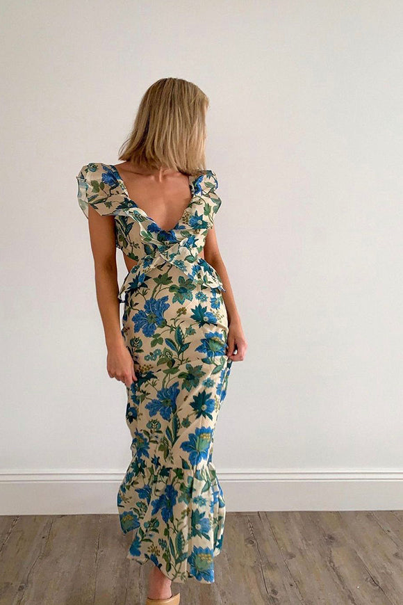 Our Celia Frill Midi is crafted from a silk cotton blend to create a feminine silhouette. With ultra-chic cutouts through the waist, delicate ruffles that carry through the shoulder and voluminous sleeves – this open back number is perfect for all occasions and a favourite of ours for summer weddings.