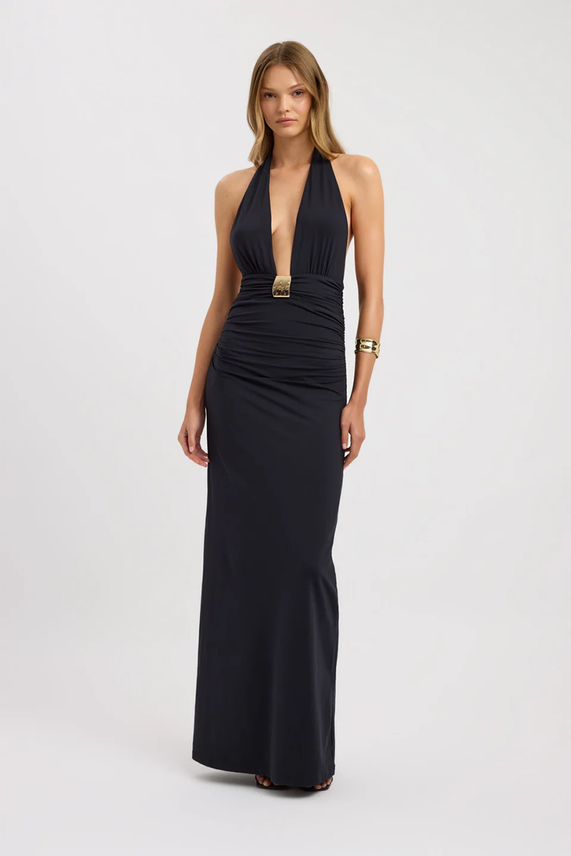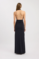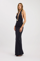 Make an entrance in the Elari Maxi Dress. Designed with a plunging halter neckline, this style exudes modern elegance and confidence. The fitted bodice and waistline highlight the figure before falling into a sleek, floor-length silhouette that elongates the frame. Crafted from a smooth Poly stretch fabrication, it offers both structure and comfort, making it perfect for evening occasions or special events.