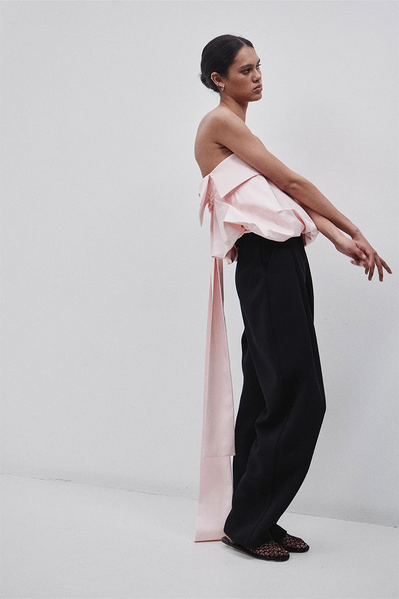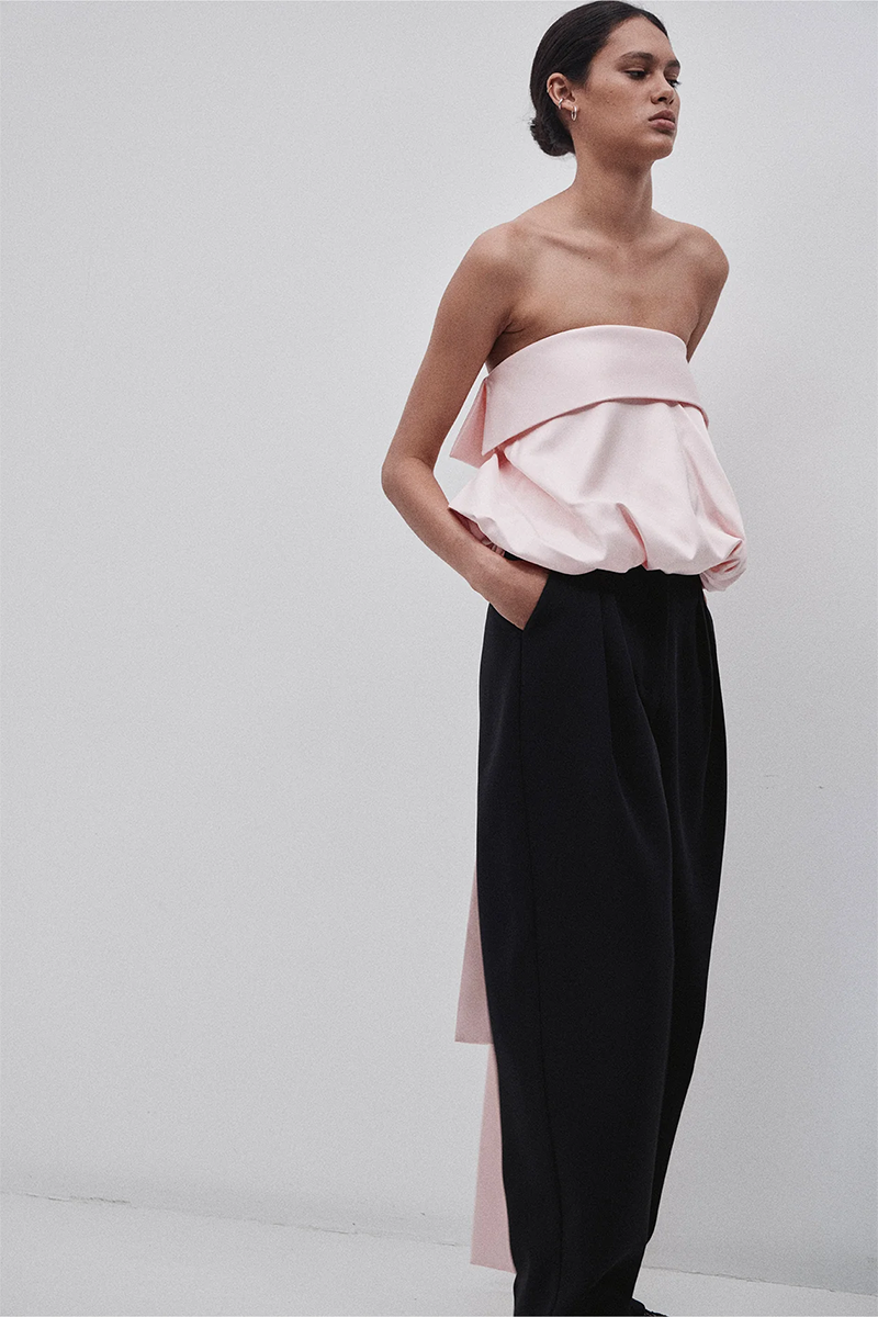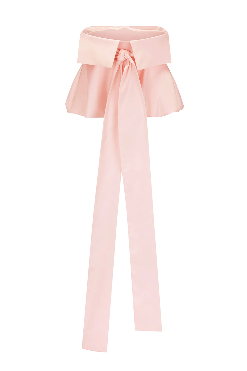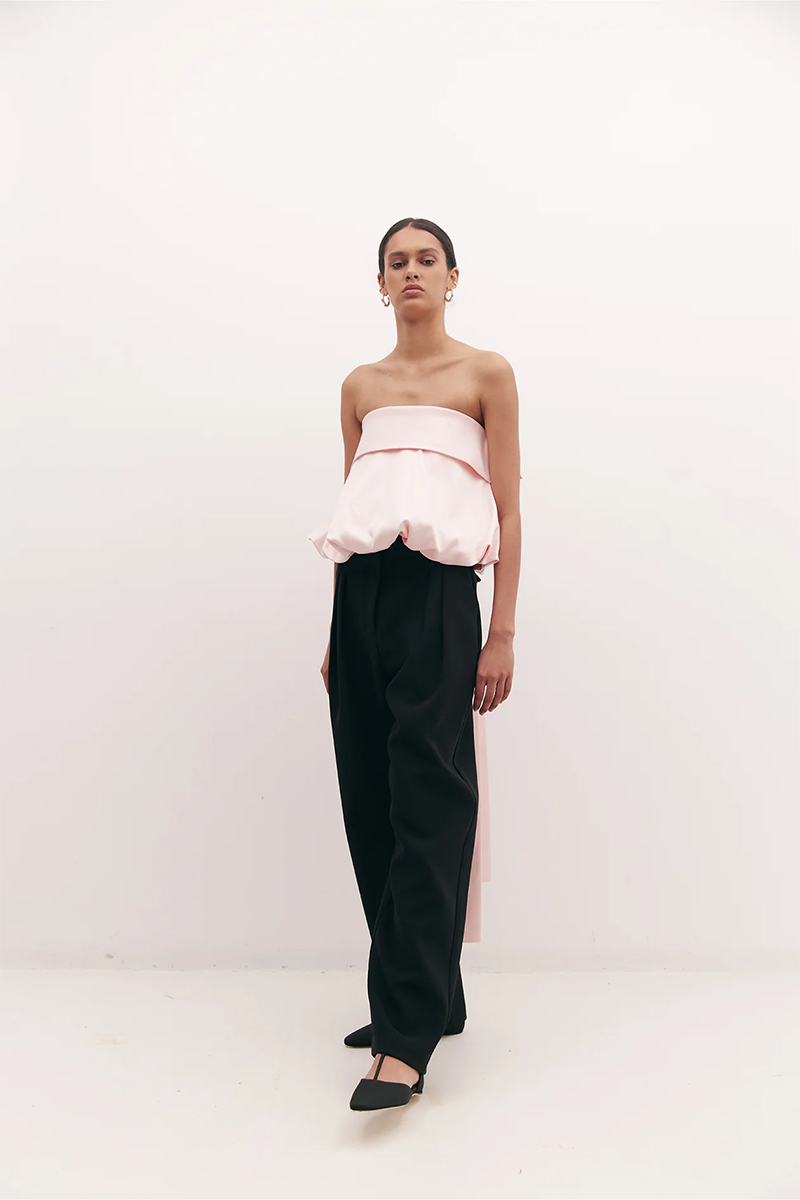 A highly coveted Harris Tapper piece, the Eliza Top subtly references lightweight cloud shaping with a soft bubble hem and long back ties. Cut in a stiff yet soft pink satin, this is the perfect piece to celebrate any occasion.