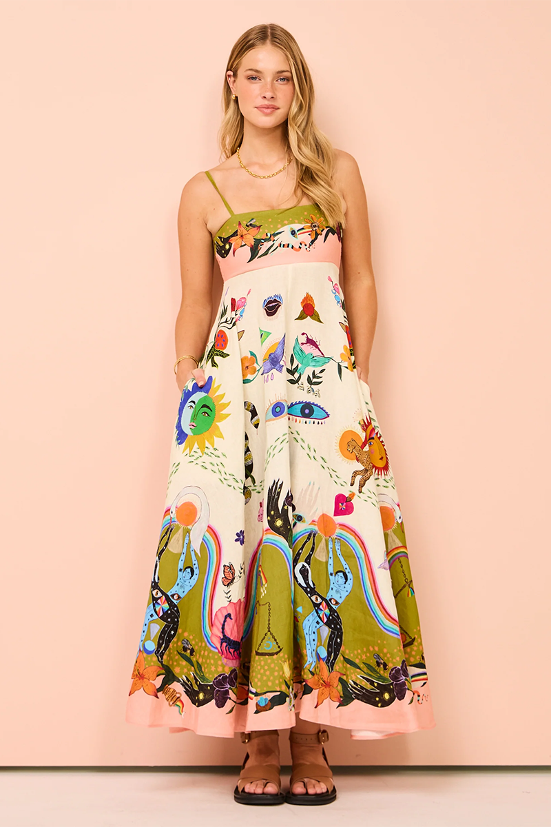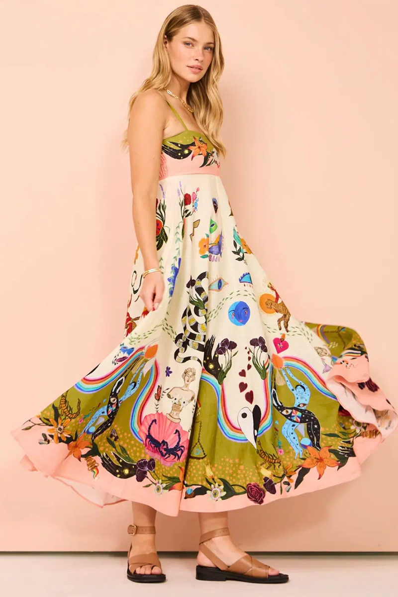 Exude effortless elegance in our Evergreen Sundress from Alemais. Crafted from a linen fabrication, this sundress features a fitted bodice, square neckline, shirred panel at the back bodice and adjustable straps.