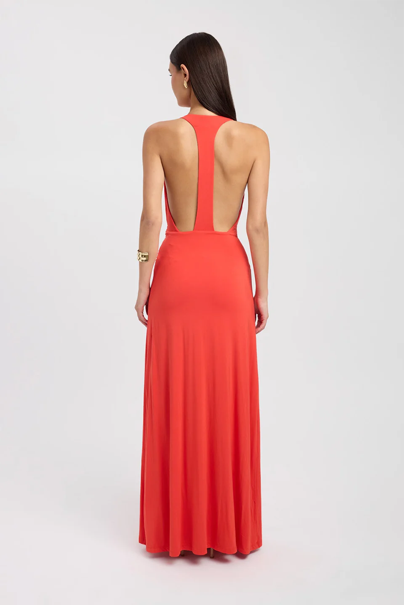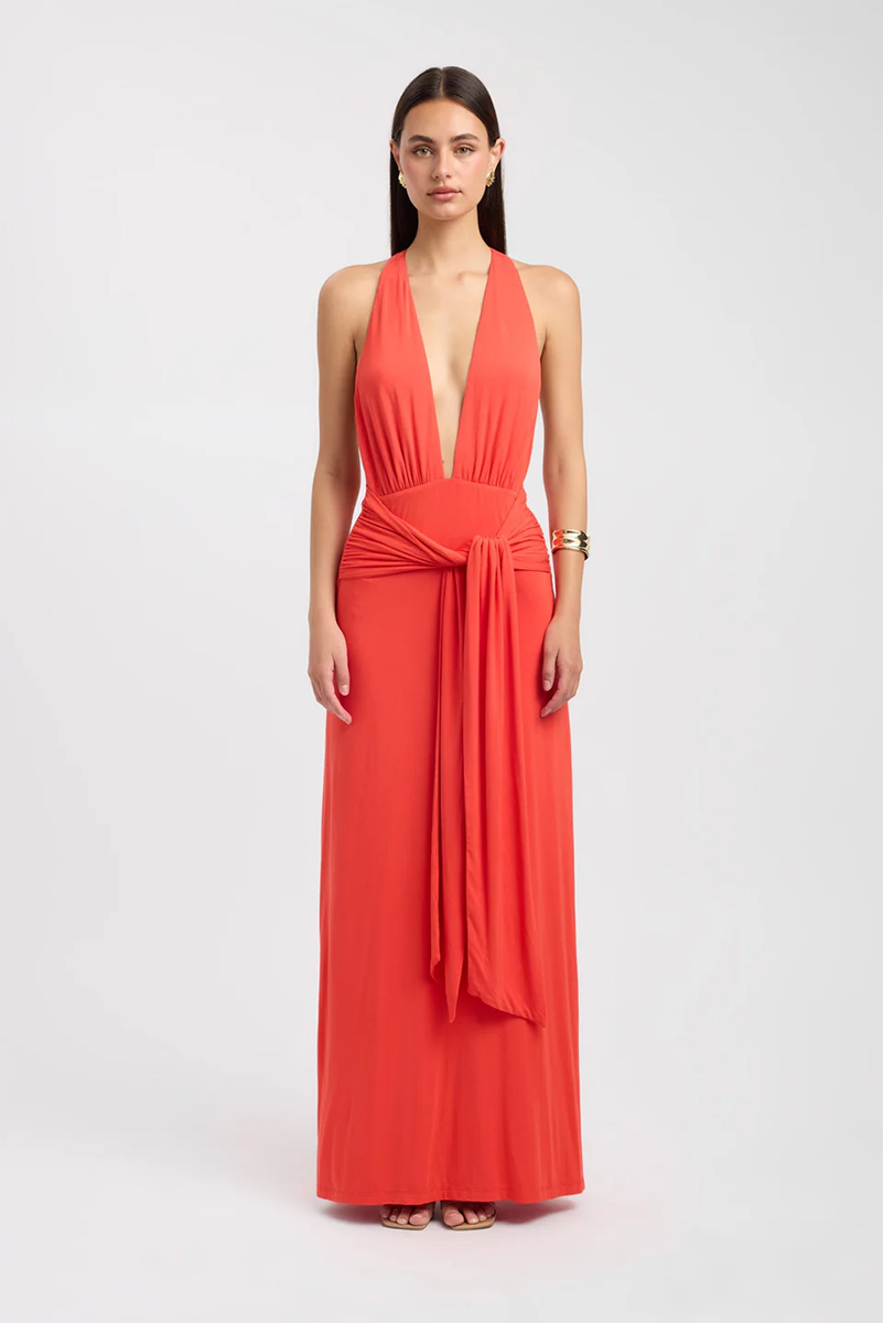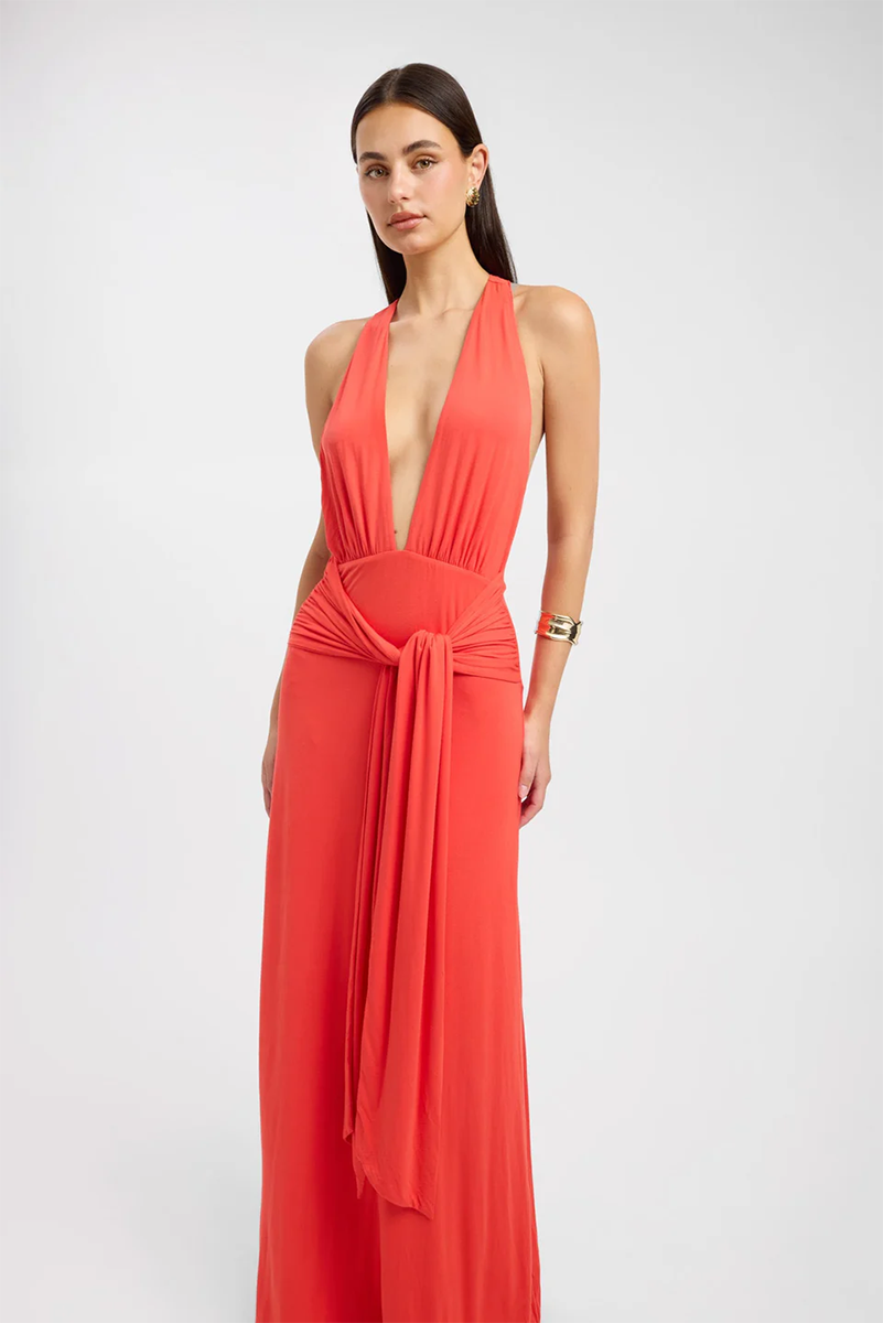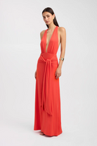 The Jasmine Maxi Dress delivers effortless elegance with its fluid silhouette and refined details. A plunging halter neckline lengthens the frame, while the softly draped bodice and adjustable sash-style waist tie add shape and movement. The sleek racerback balances the dramatic front, flowing into a full-length skirt that moves beautifully with every step - ideal for evenings that call for a polished, understated look.