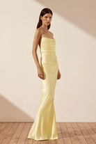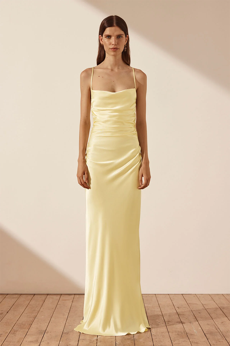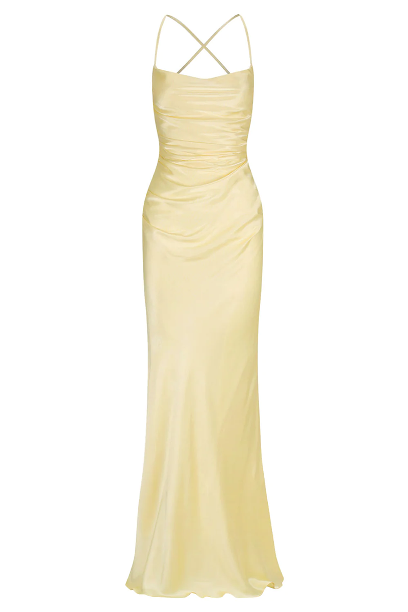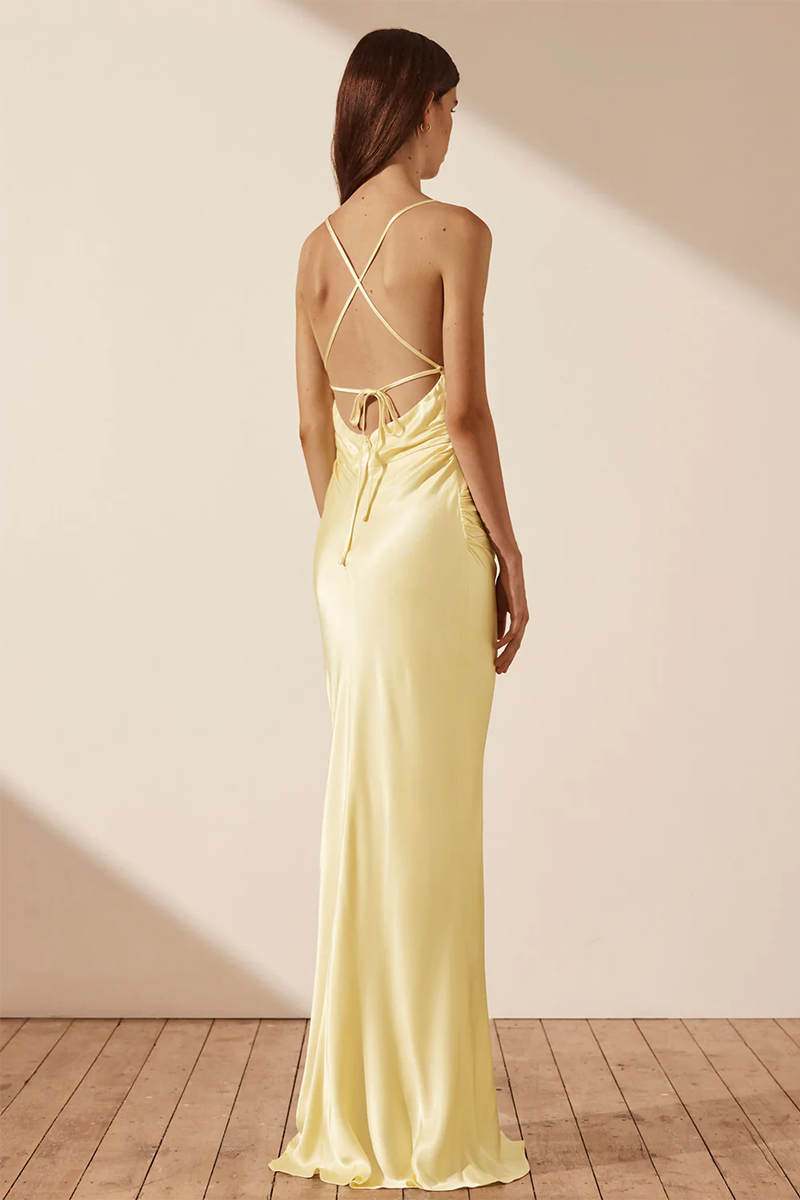 Our La Lune Lace Back Maxi from Shona Joy is one of our favourite lemon gowns. Made from luxurious silk touch fabric, this dress features a cowl neckline and adjustable lace up back. The maxi length skirt makes it perfect for weddings, balls or extra special occasions.
