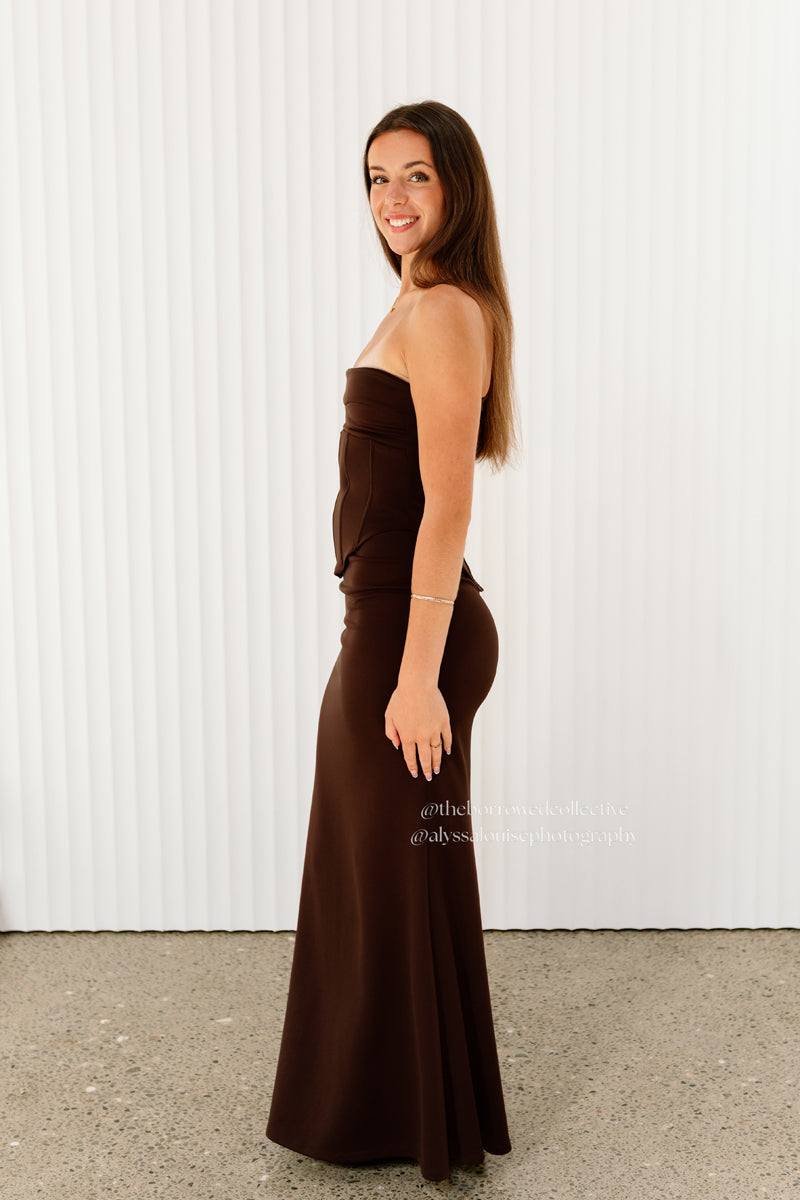 Introducing the Louie Gown a stunning two-piece gown. Featuring a structured corset top and maxi skirt crafted from luxurious buttery fabric, this gown combines style and comfort. Elevate your winter wardrobe with this versatile piece that exudes sophistication and charm.