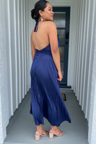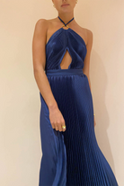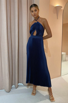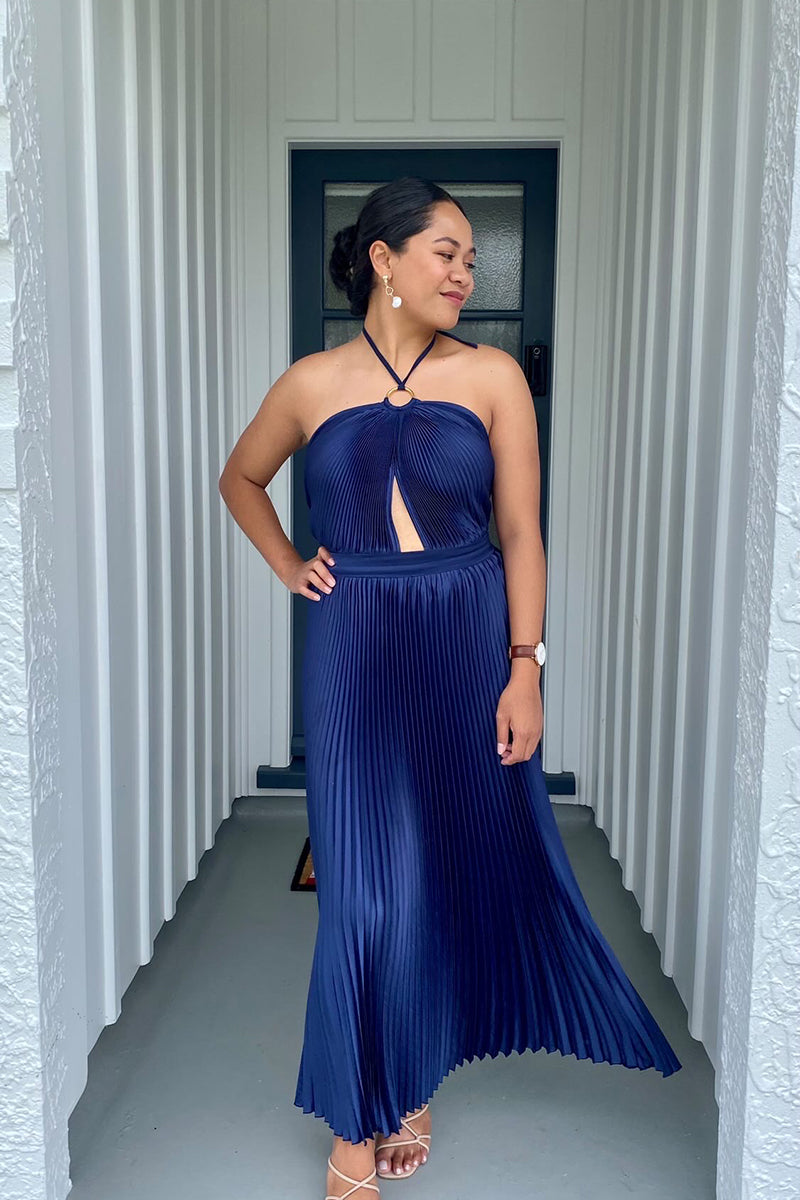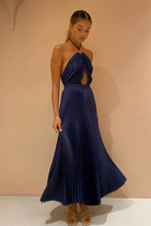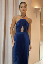 A play on a signature moment, the Reveil gown is a detailed midi with signature ribbed pleating through the torso which softens into an elegant umbrella pleated A-Line skirt. Highlighting the femme silhouette with the halter neckline with a 70's ring feature and subtle cut out at torso, this midi dress is perfect for formal soirees, weddings and birthday celebrations. We can see why this is one of our most popular rentals!