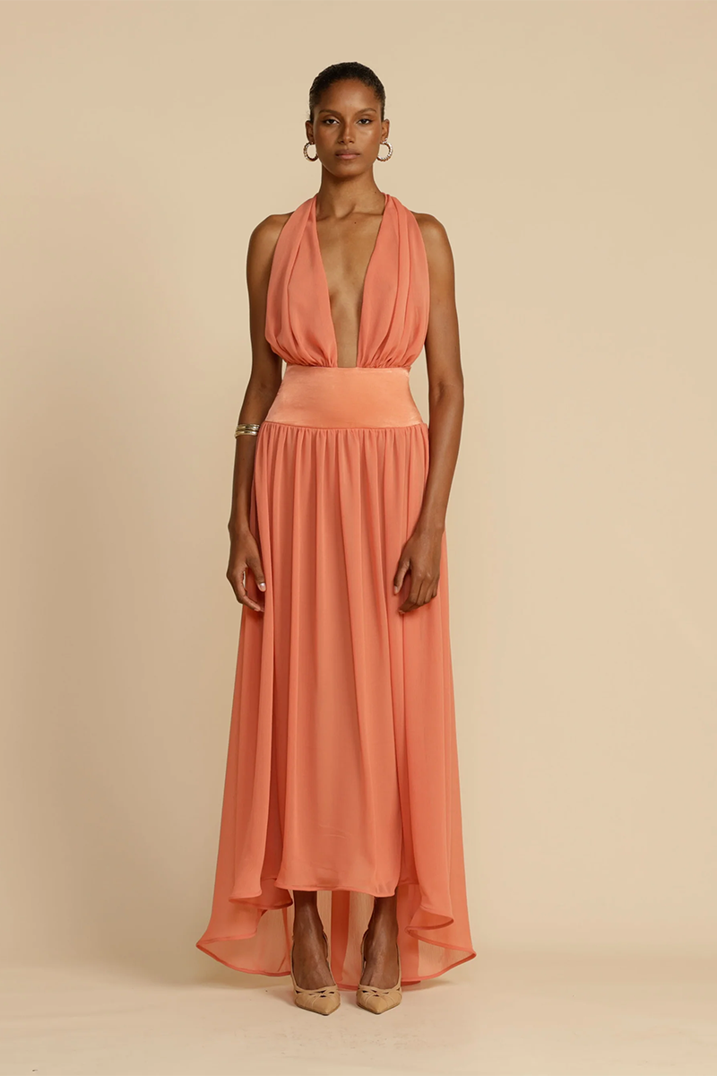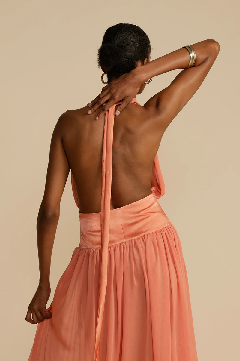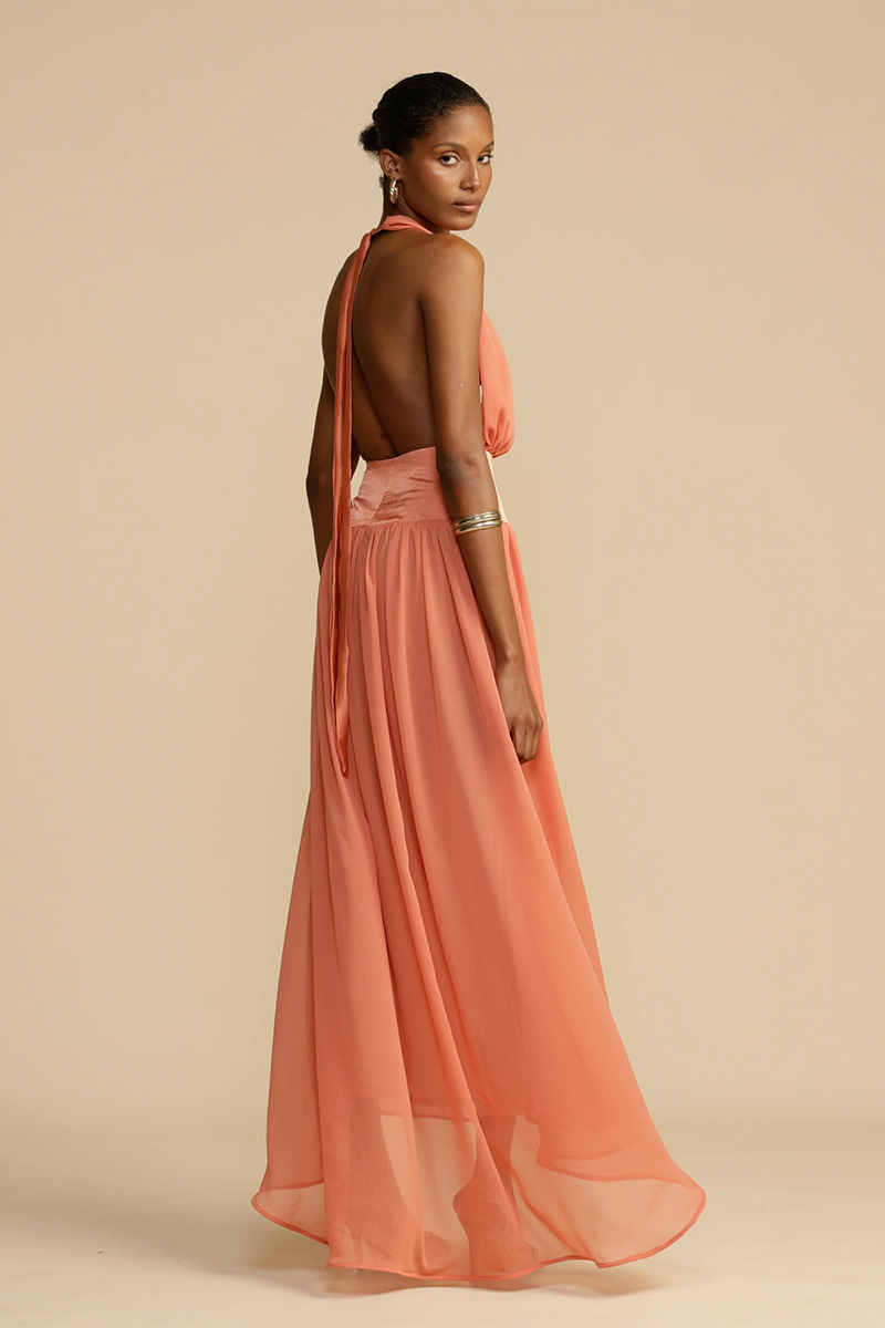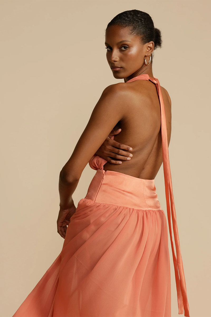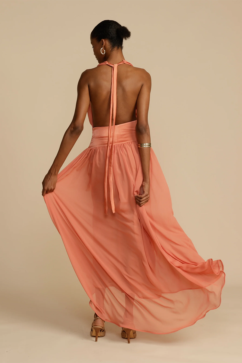 Introducing Serena, a striking fusion of femininity and elegance. Designed in a lustrous Coral hue, she radiates a warm and earthy charm. Serena features a flattering drop-waistband crafted from a quality viscose. Her graceful georgette drape cascades over the bust and flows from the hips. Fasten her sensual halter neckline securely around your neck, and let the ties gracefully trail down the open back. Lined to complete, Serena is the perfect selection for your sunlit seasonal sips.