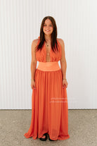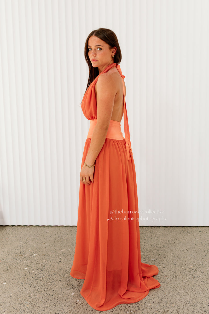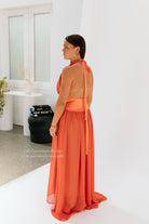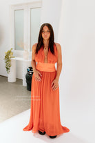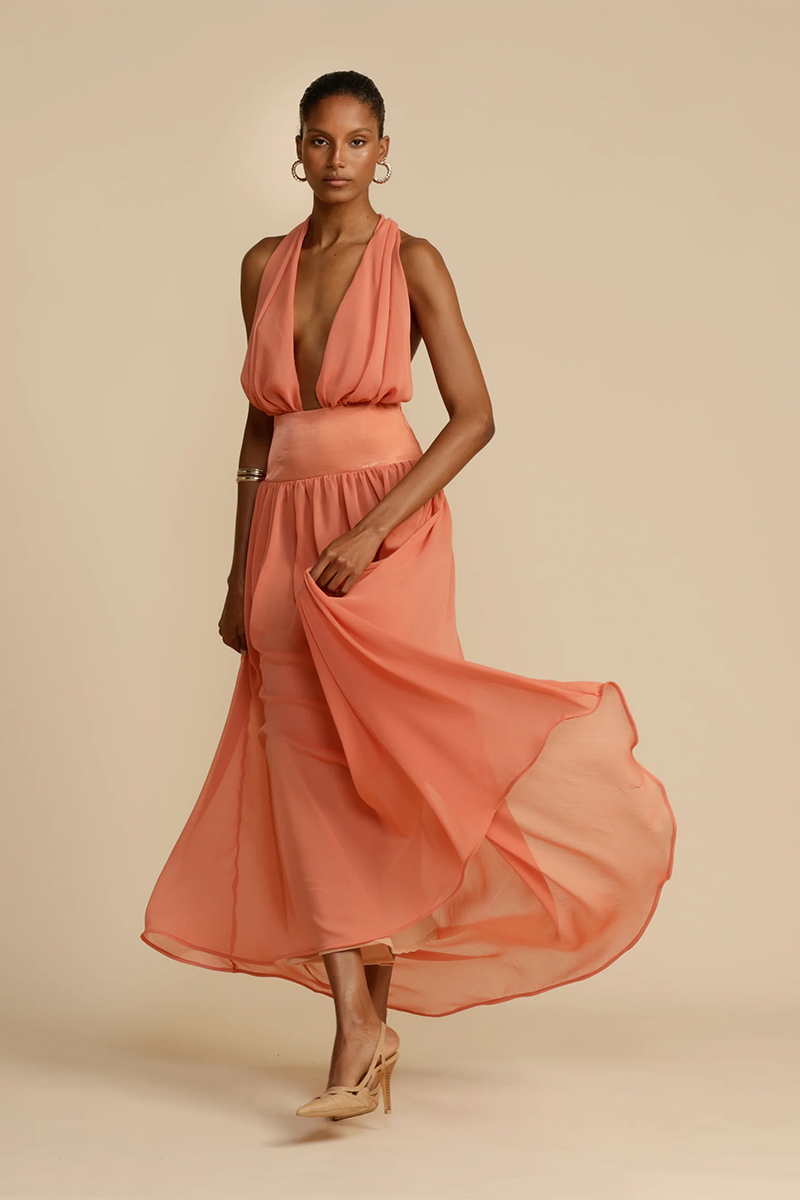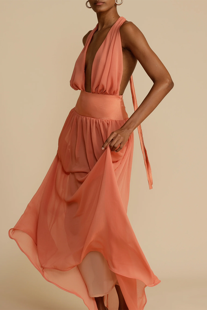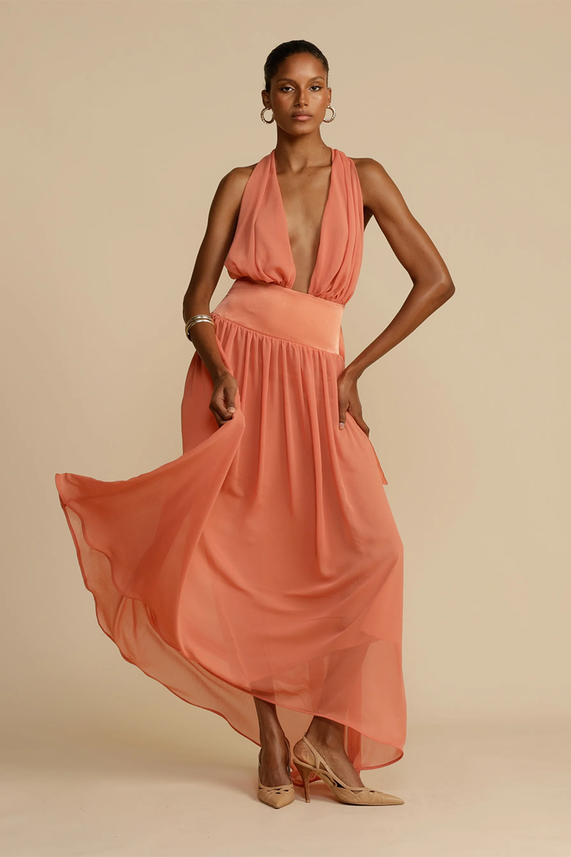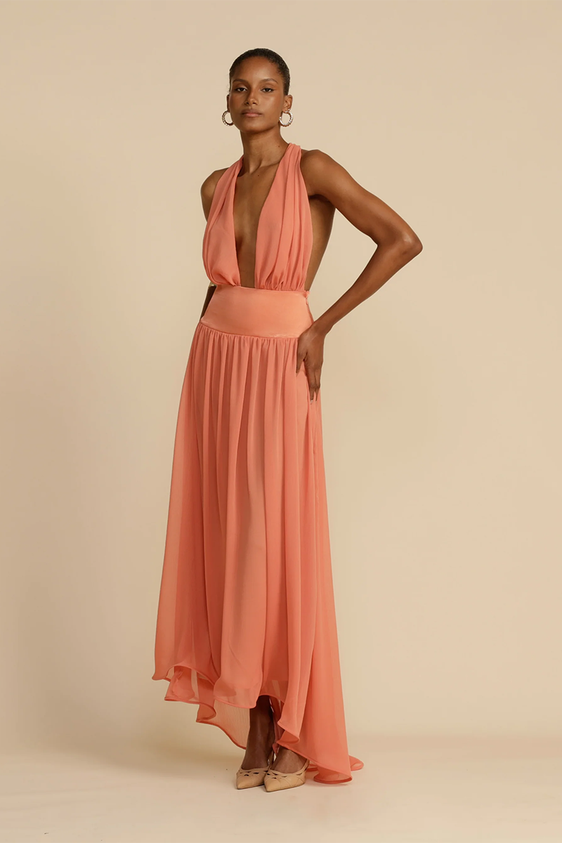Introducing Serena, a striking fusion of femininity and elegance. Designed in a lustrous Coral hue, she radiates a warm and earthy charm. Serena features a flattering drop-waistband crafted from a quality viscose. Her graceful georgette drape cascades over the bust and flows from the hips. Fasten her sensual halter neckline securely around your neck, and let the ties gracefully trail down the open back. Lined to complete, Serena is the perfect selection for your sunlit seasonal sips.