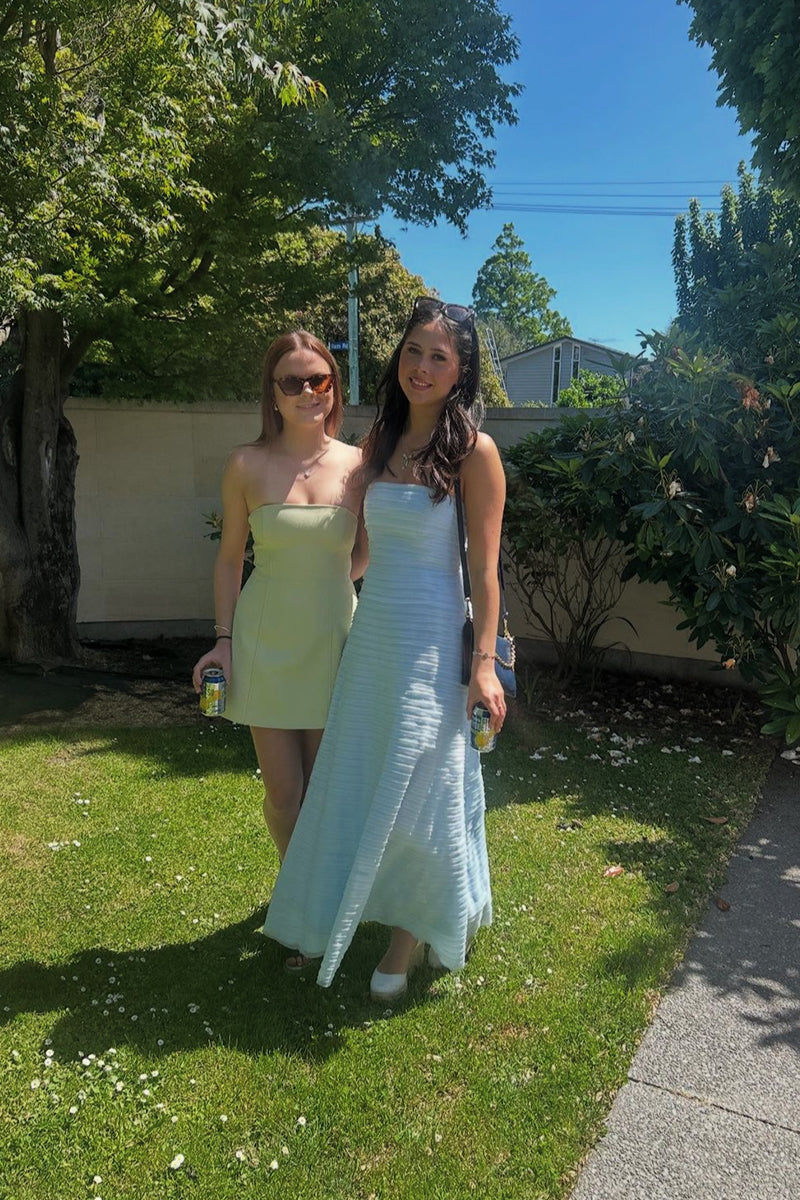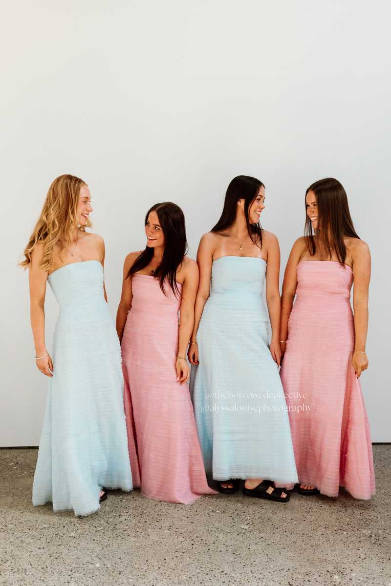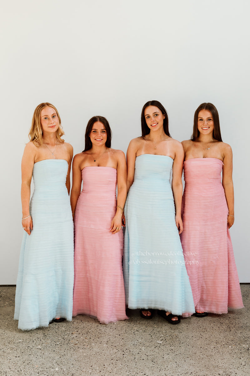 Be a vision in the gorgeous Soundscape Maxi Dress rental from Aje. This strapless maxi sports horizontal organza frills throughout in a sea breeze shade of blue for an ultra-feminine look. Perfect to hire for weddings, the fitted bodice with internal boning falls into a voluminous skirt for a showstopping silhoutte.
