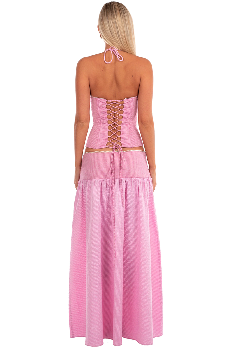 Effortlessly feminine with a nostalgic twist, the Adeline Set is your go-to for timeless elegance with a modern edge. Crafted from 100% cotton in a soft pink contrast stripe, this set pairs the structured Adeline Corset with the flowing Adeline Maxi Skirt for a beautifully balanced silhouette.