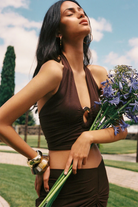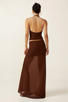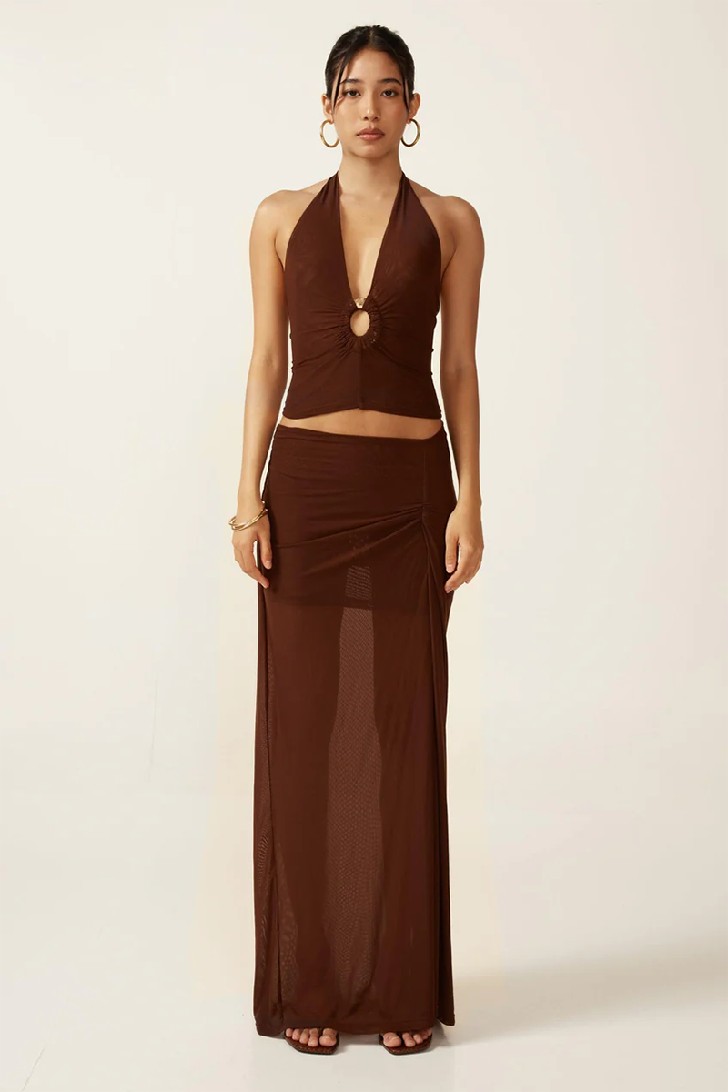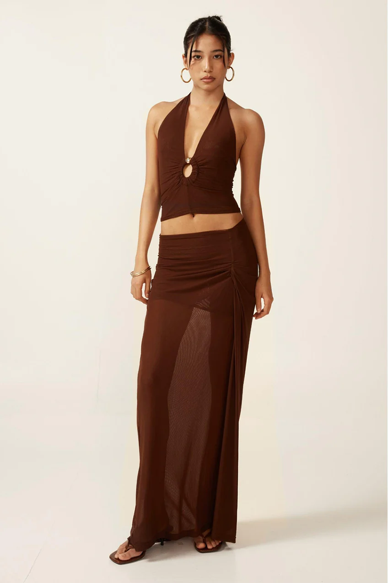 Paired with the Nellie Top, this chocolate brown mesh masterpiece is designed with a sleek low halter neckline and a striking gold hardware centerpiece. Ruched fabric wraps around the detail, sculpting the waist with a flawless balance of structure and softness.