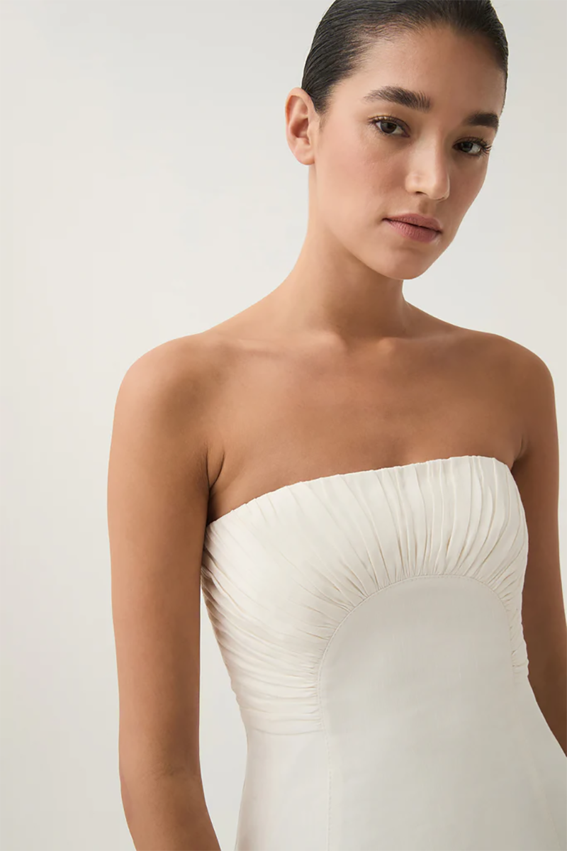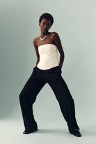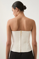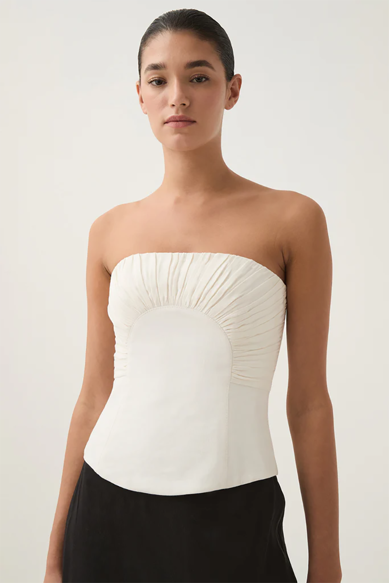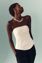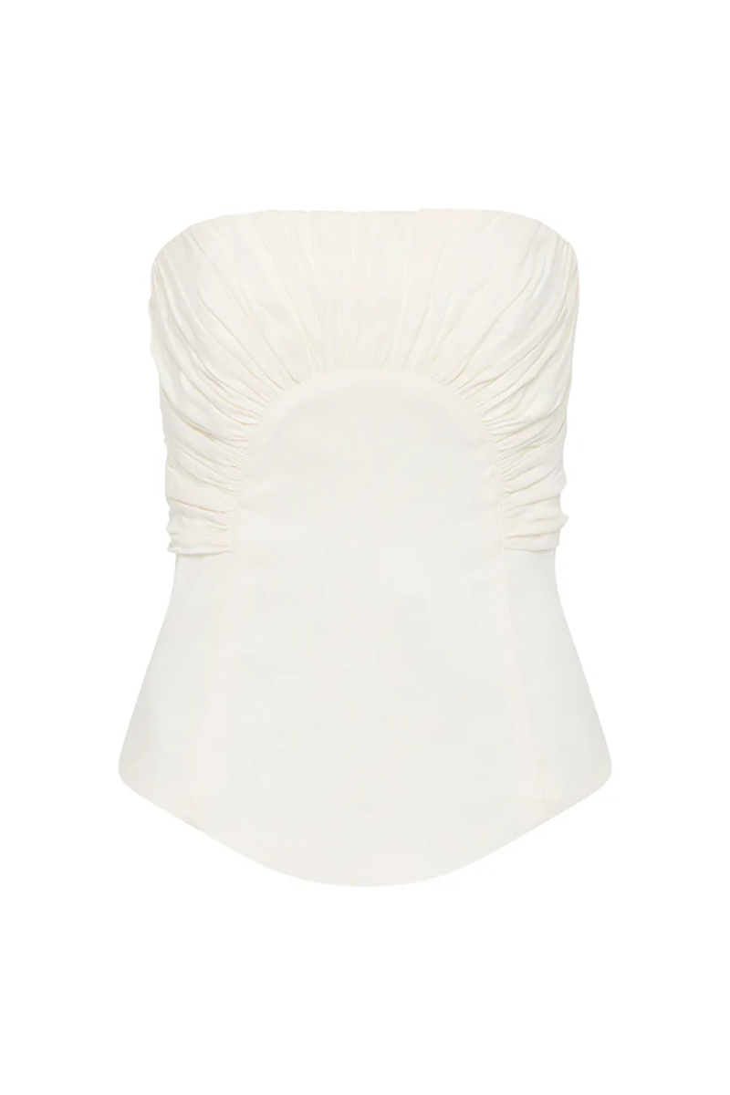 Uniquely you, the Oriel Ruched Bustier top from Aje is a corset that bends boundaries. This strapless ivory top features internal bodice boning and a curved ruched panel - giving it a unique shape and fit. Perfect for pairing with jeans or your favourite skirts for a sophisticated look.