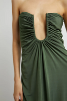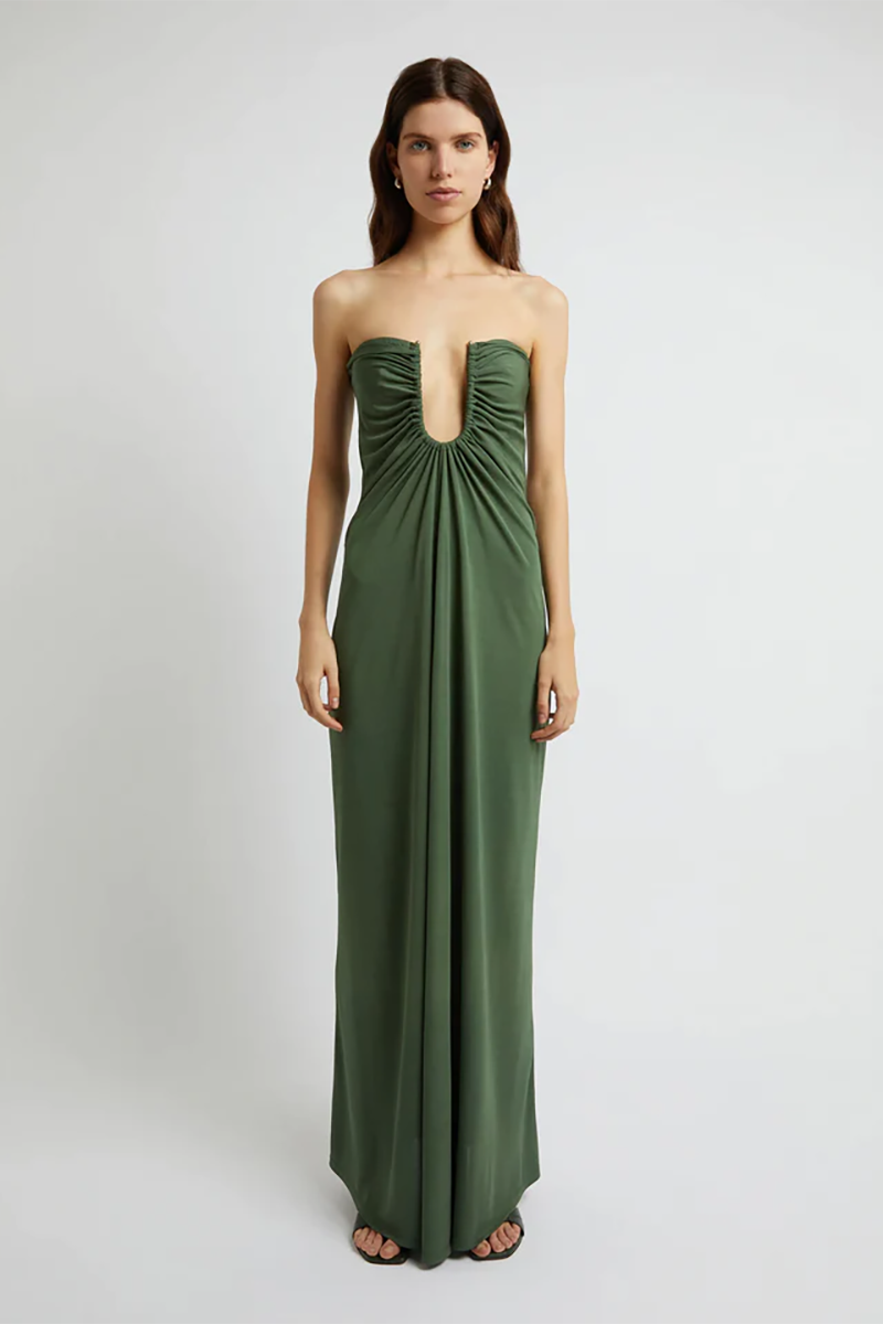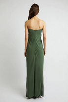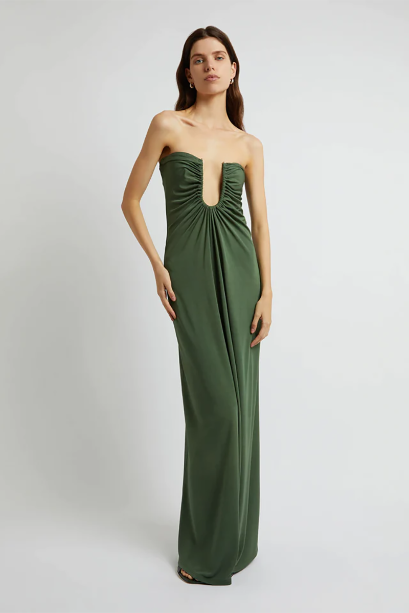 The Arced Palm Strapless Dress features a plunging neckline with a deep U prong. This gorgeous bottle green number drapes perfectly creating a flattering waterfall effect when on. This dress is the perfect rental for wedding or ball season.