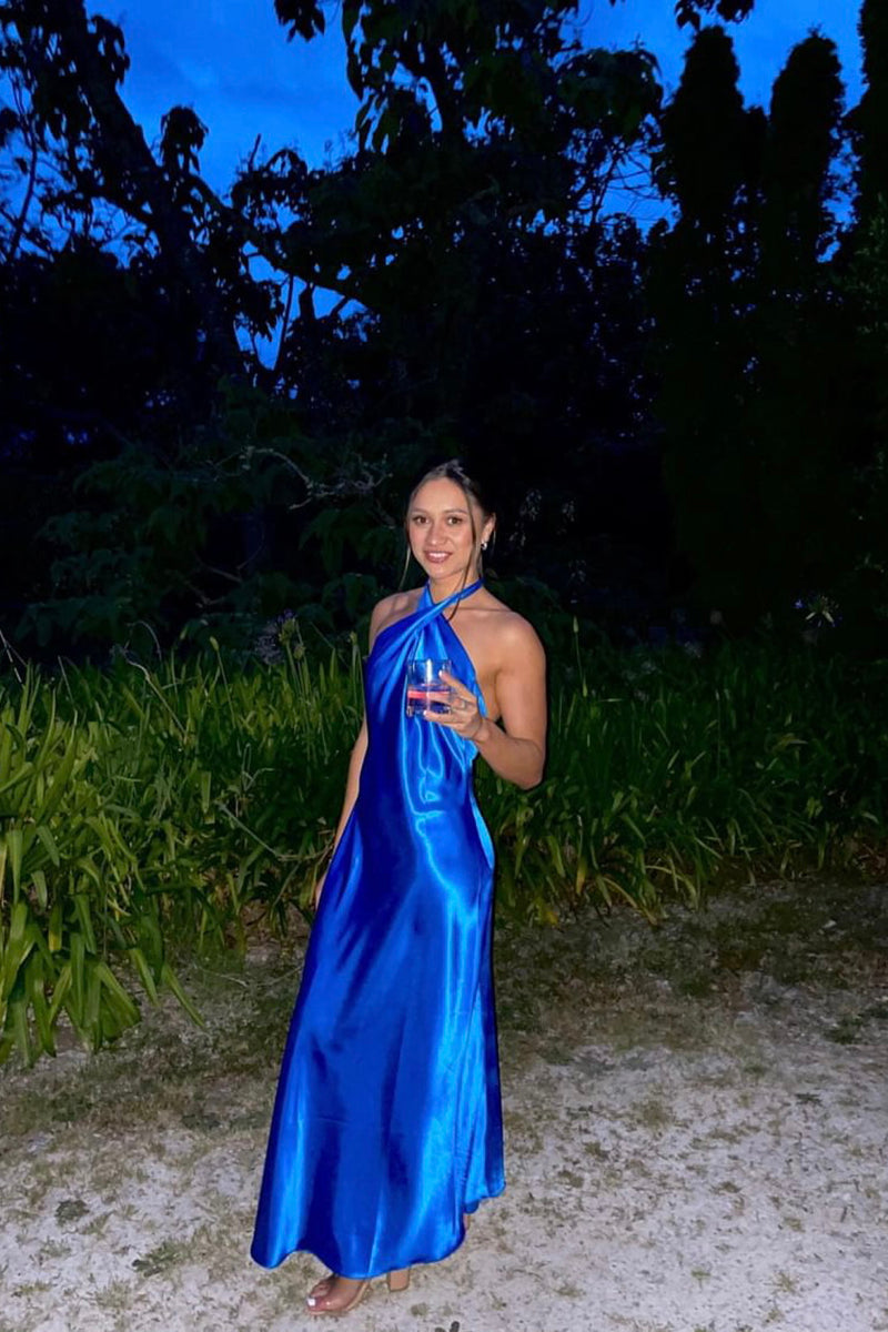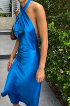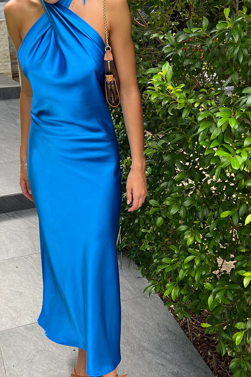 The Blue crossover maxi is a bias cut full length dress with a crossover neck feature. The adjustable neck tie and deep v back make this the perfect blue number to rent for your next special event.