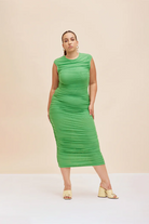 Turn heads in this ultra-flattering Bounce Mesh Tank Dress in vibrant green. Crafted from sheer stretch mesh, this bold maxi is designed to sculpt and contour with its figure-skimming fit and ruched side seams. The tank-style neckline keeps it effortlessly cool, while the full-length silhouette adds instant drama. Whether you're dressing it up for an event or layering it over a slip for an elevated everyday look, this dress is made to move with you—and make a statement while doing it.