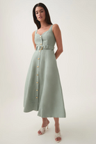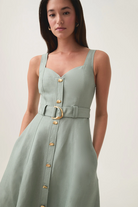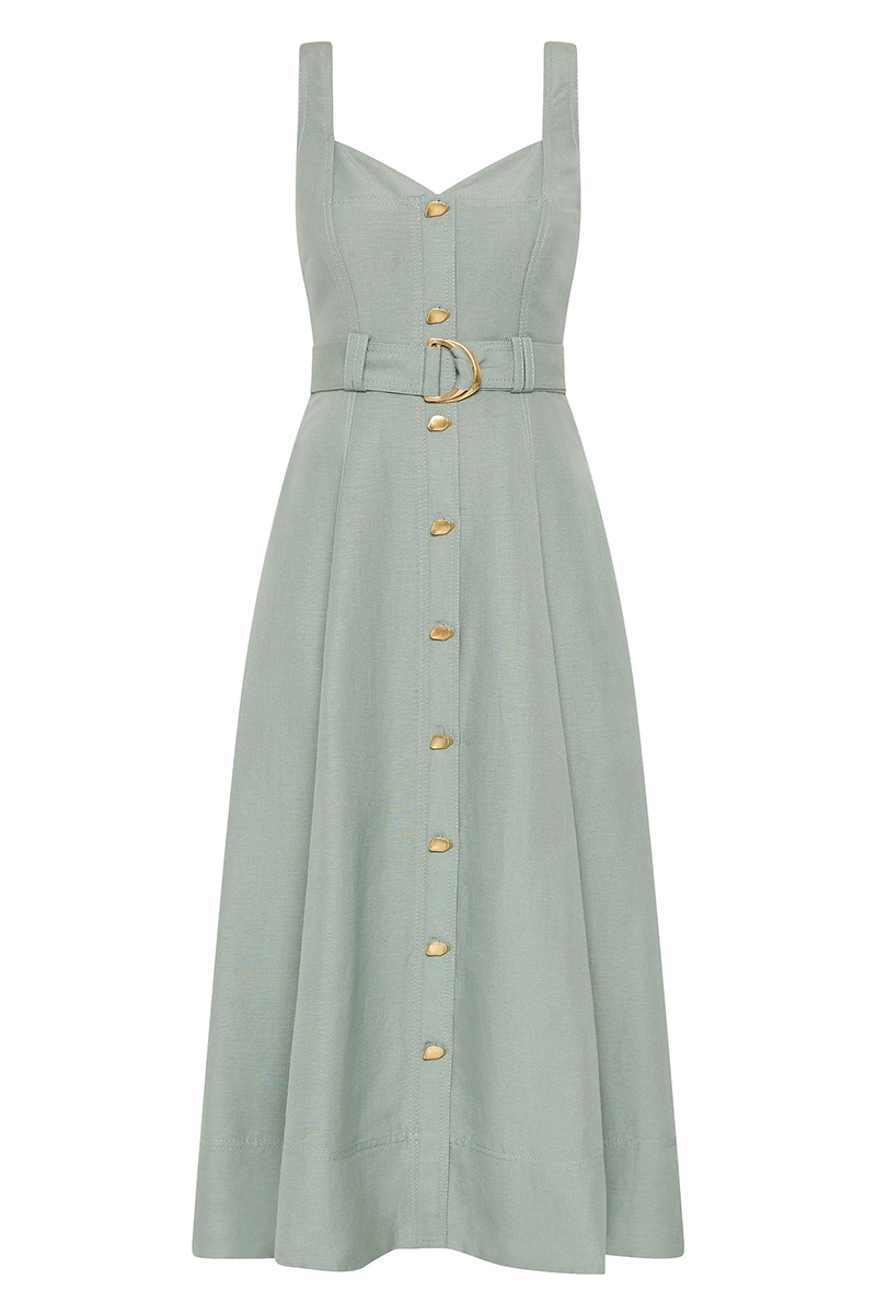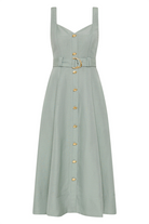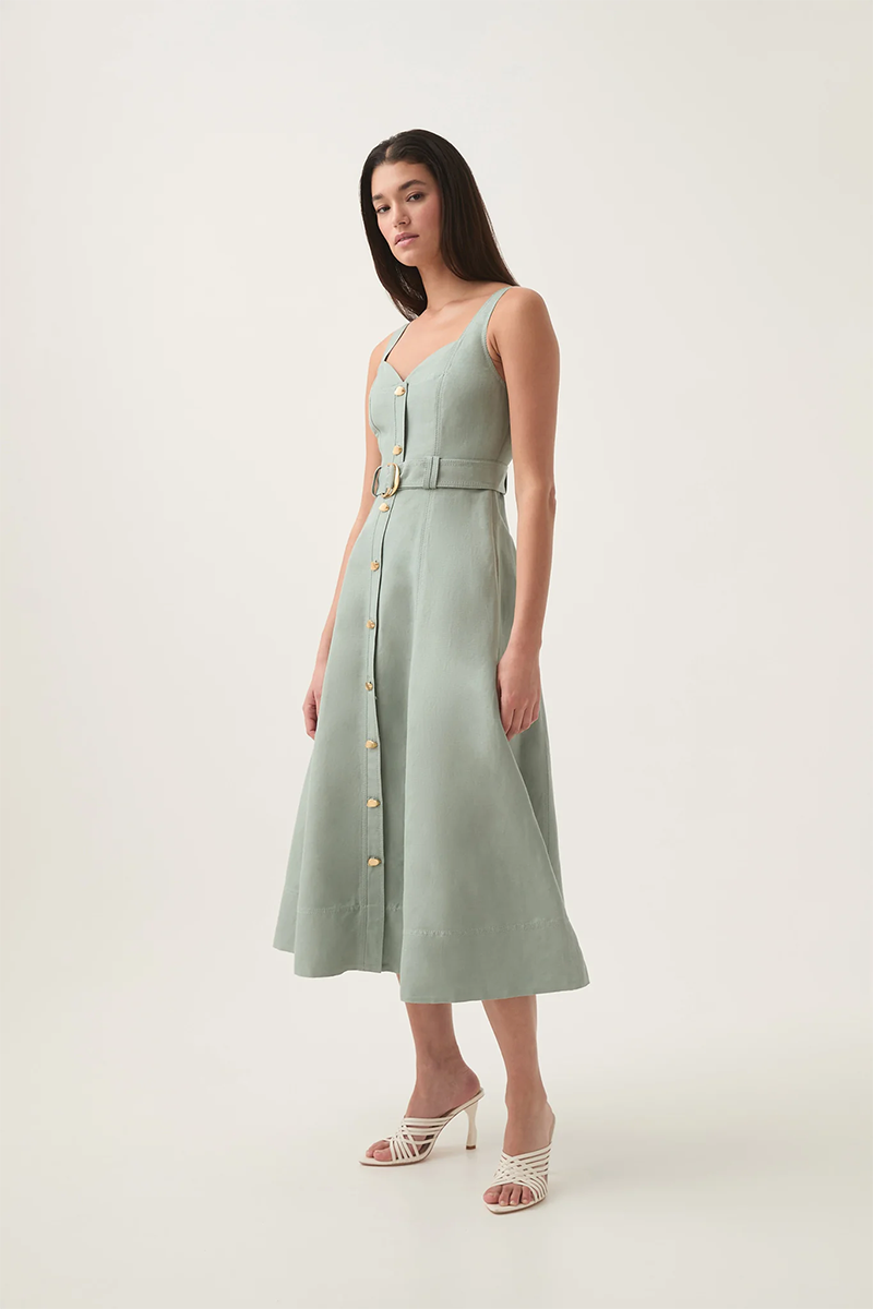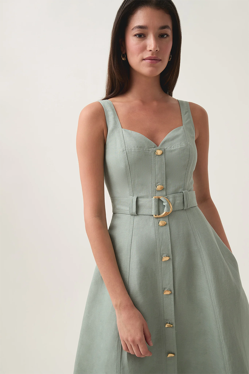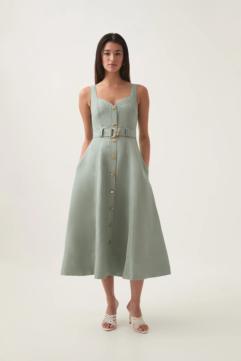 Elevate your everyday style with the Clay Belted Midi Dress from Aje. Designed with a flattering A-line silhouette, this women’s midi dress features tank straps and a sweetheart neckline, creating a timeless yet feminine look. The front button placket adds a touch of sophistication, while the twin belt loops and self-tie belt with a metal D-ring buckle cinch the waist for a perfect fit. Made from a breathable blend of 55% linen and 45% rayon, this dress is lined for comfort and versatility, making it the ideal rental for warm-weather outings or casual chic occasions.