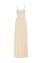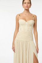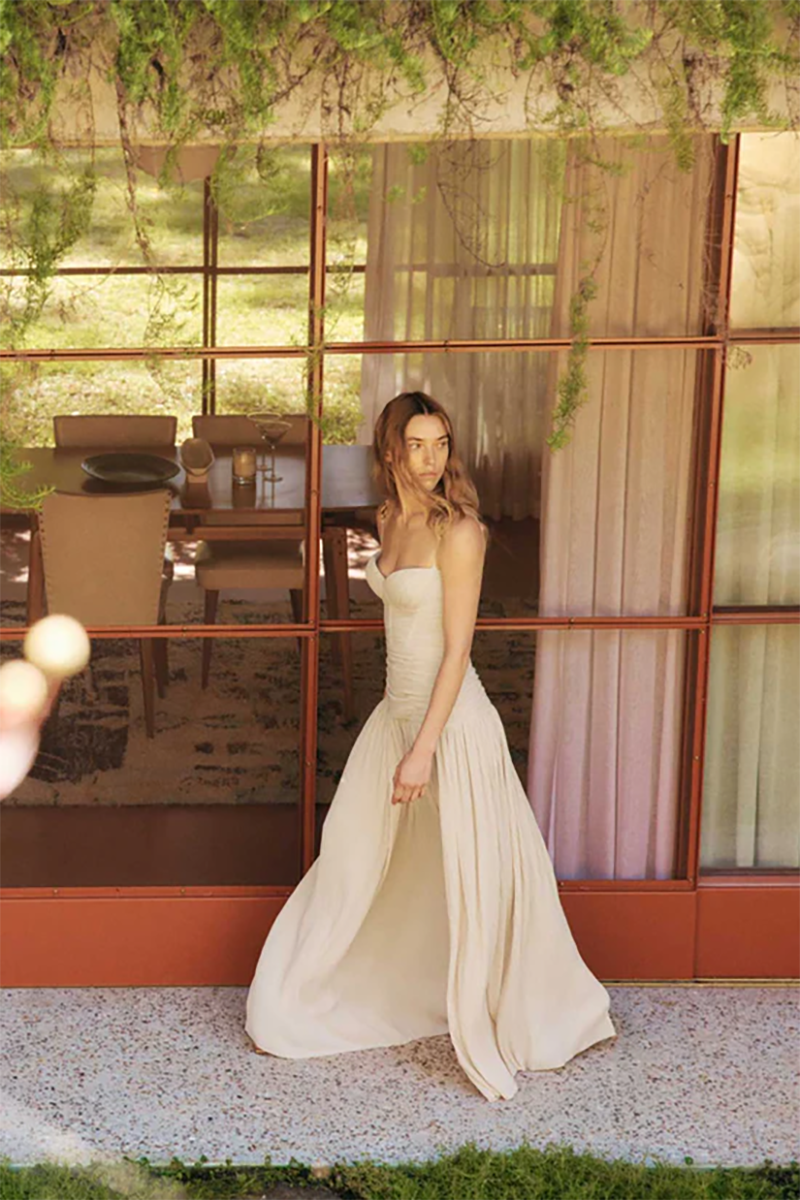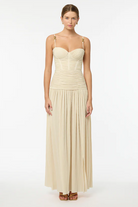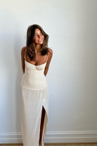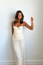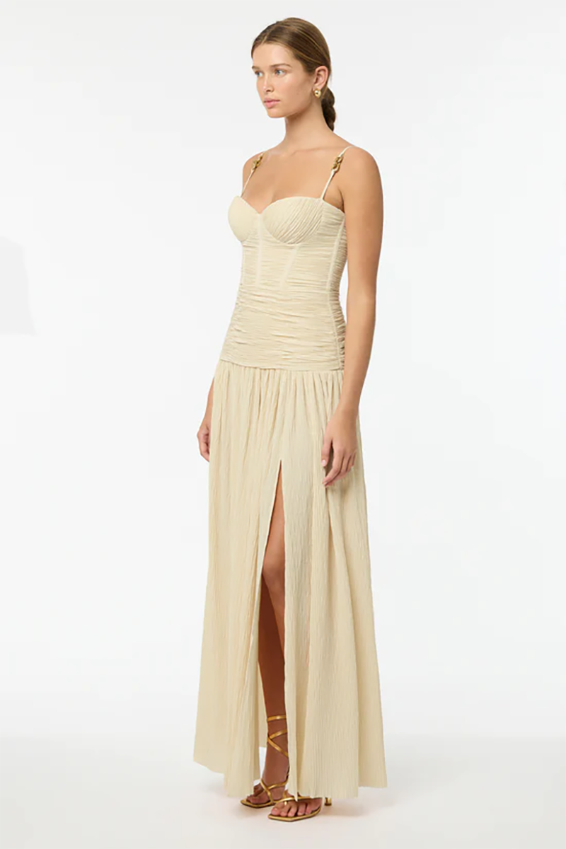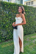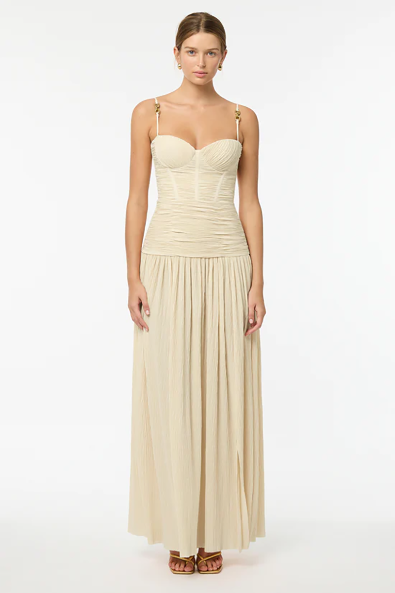 Make a stylish statement at your next event in the Double Time Pleat Dress. The dress features elegant pleats throughout and considered boning through the corset top and flows into a beautiful maxi skirt with a subtle split. Rent this dress for ball season, 21sts or engagement party!
