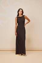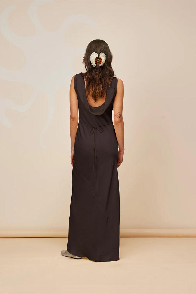 Our Firebird Cowl Gown from Ruby is a dreamy sleeveless midi dress crafted from rich chocolate satin. With a minimal silhouette and cowl back detail, this dress features a tie to cinch in the waist and is one of our favourites to rent for weddings and ball season.