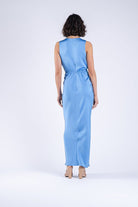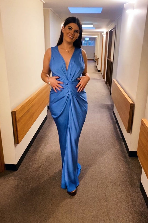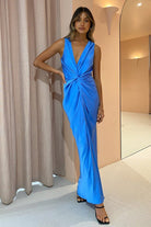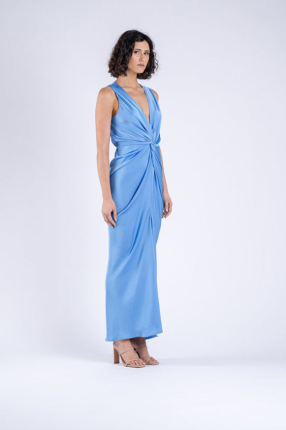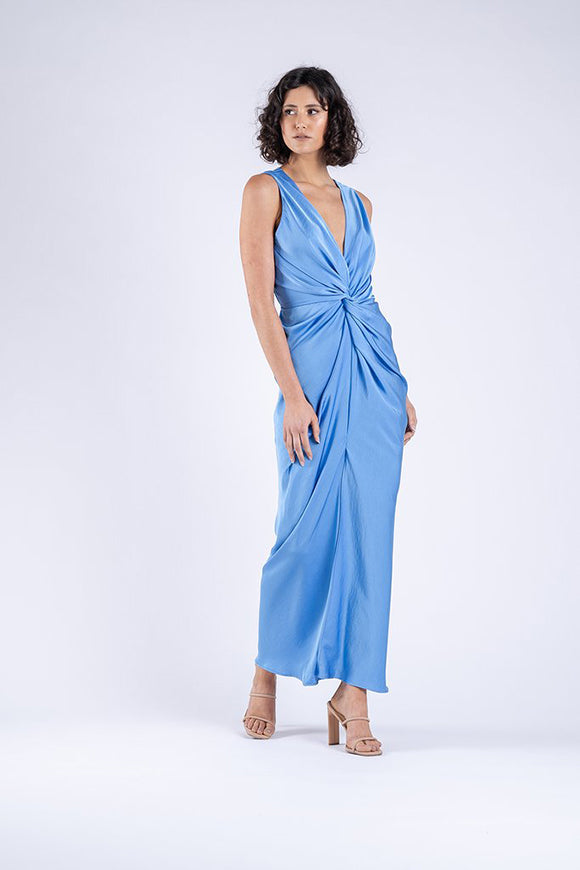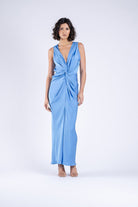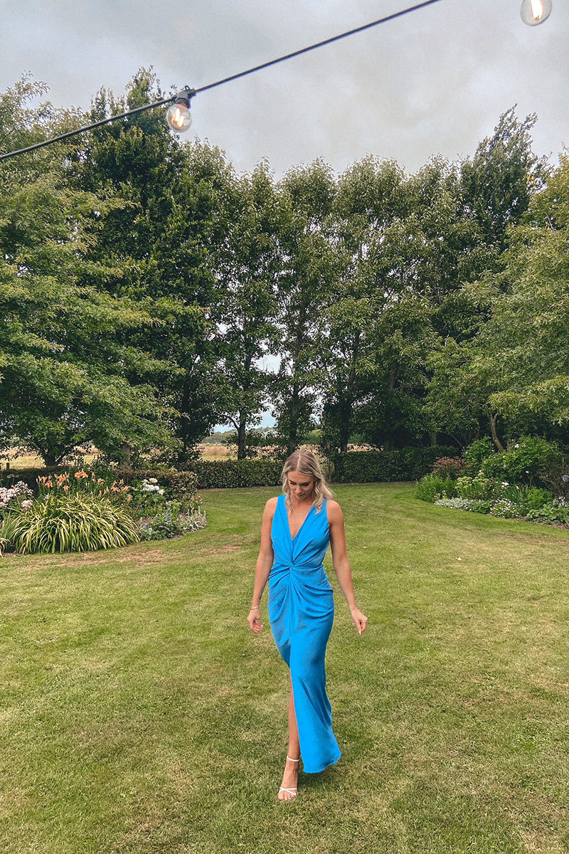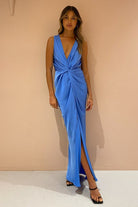 Our Gaia Maxi in gorgeous azzure blue is an elegant maxi with a stunning silhouette and lustrous finish. Designed to accentuate and flatter the figure, the central knot detailing cinches in at the waist, and the deep v neckline makes this perfect to hire for special events and formal occasions.