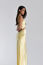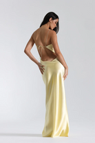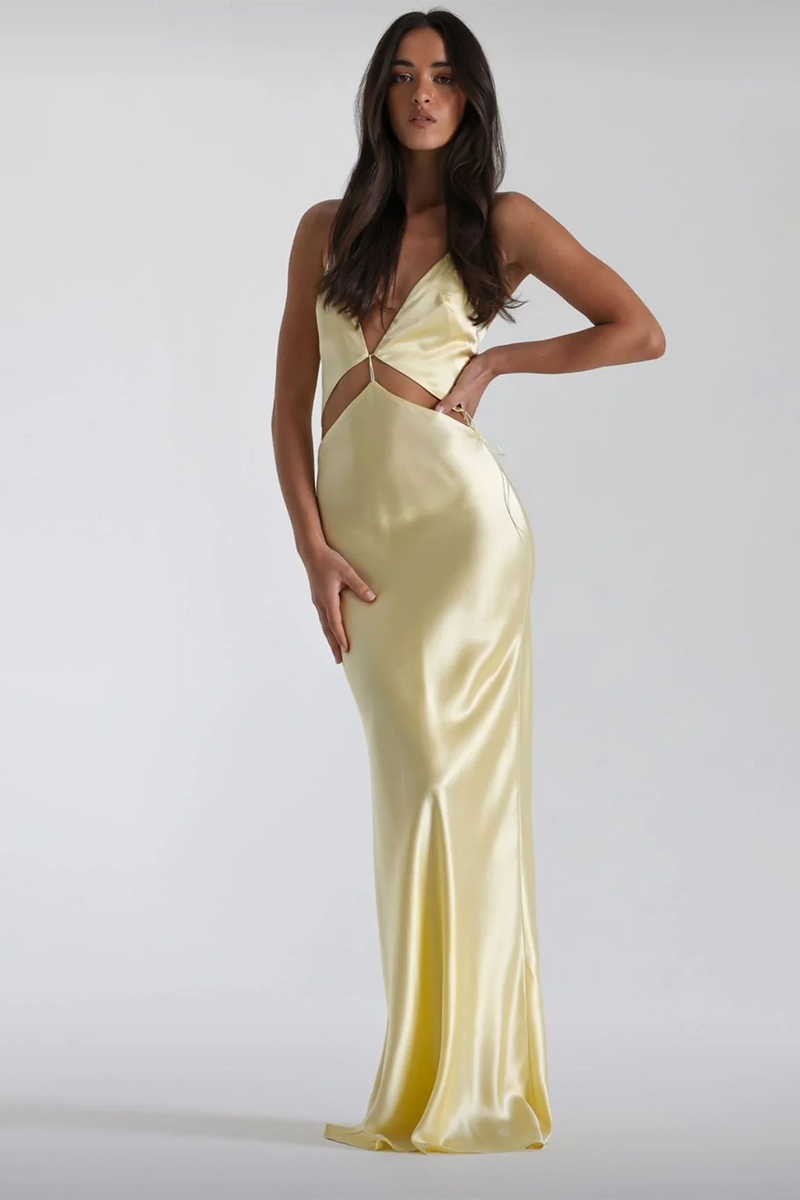Thoughtfully crafted with French seams and double-lined bust pieces for a smooth, refined finish, Iris features a flattering cut-out waist with adjustable cord ties that cinch to perfection. Delicate tie straps and an exaggerated low back invite just the right amount of drama, while the fluid silk length elongates the form.