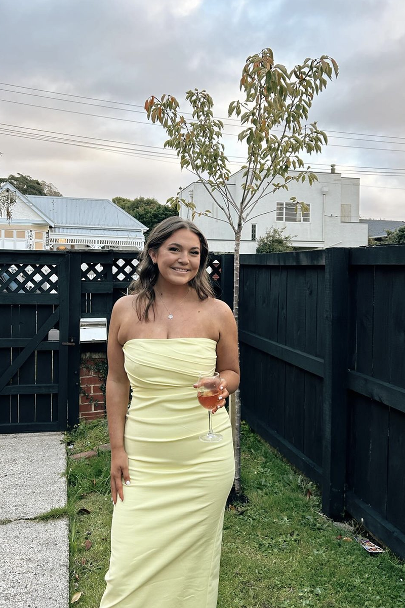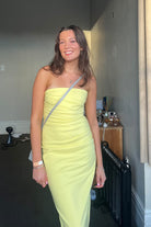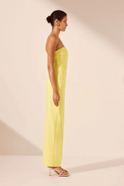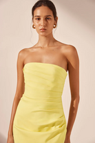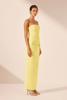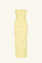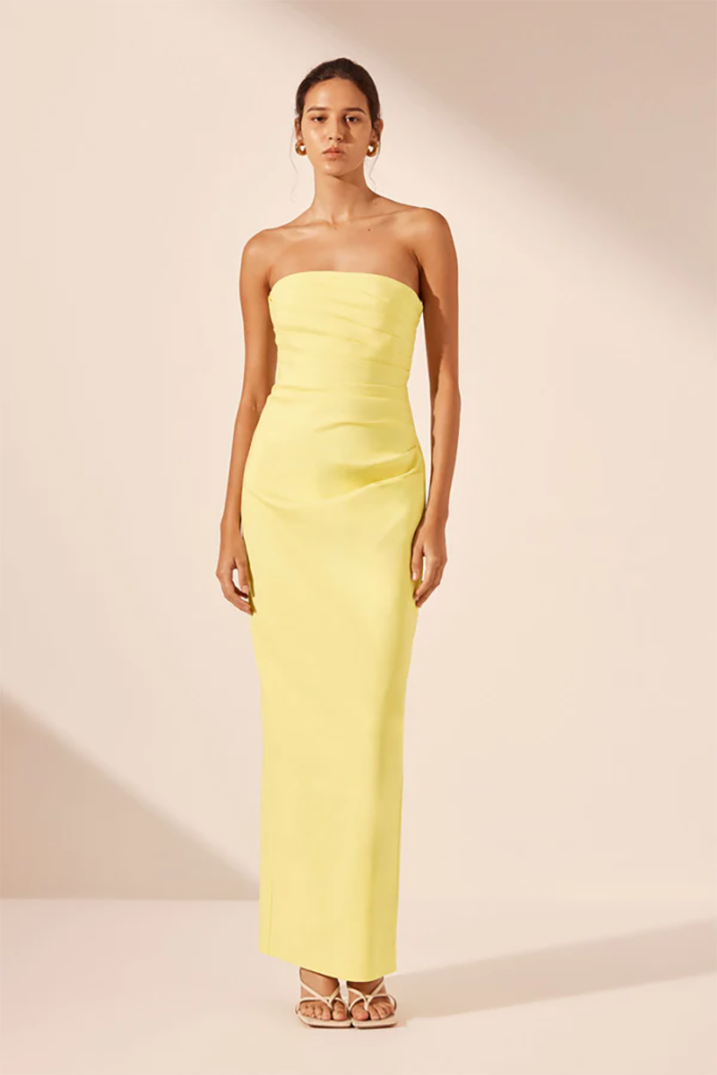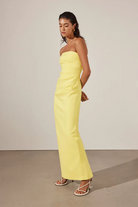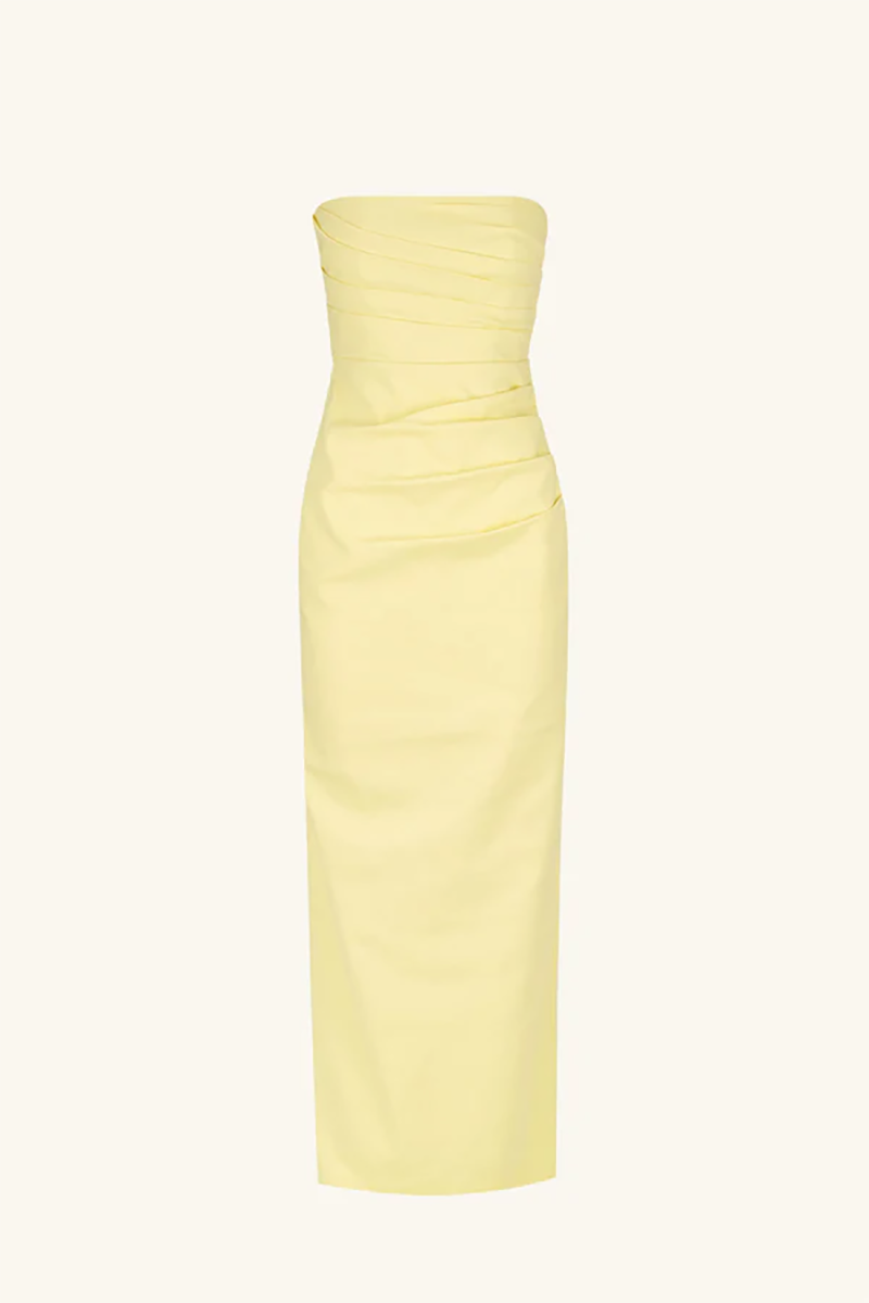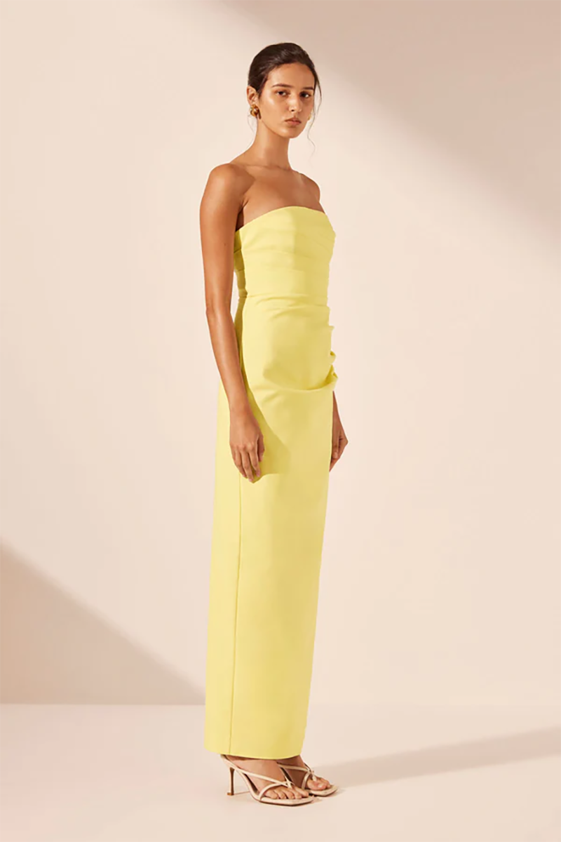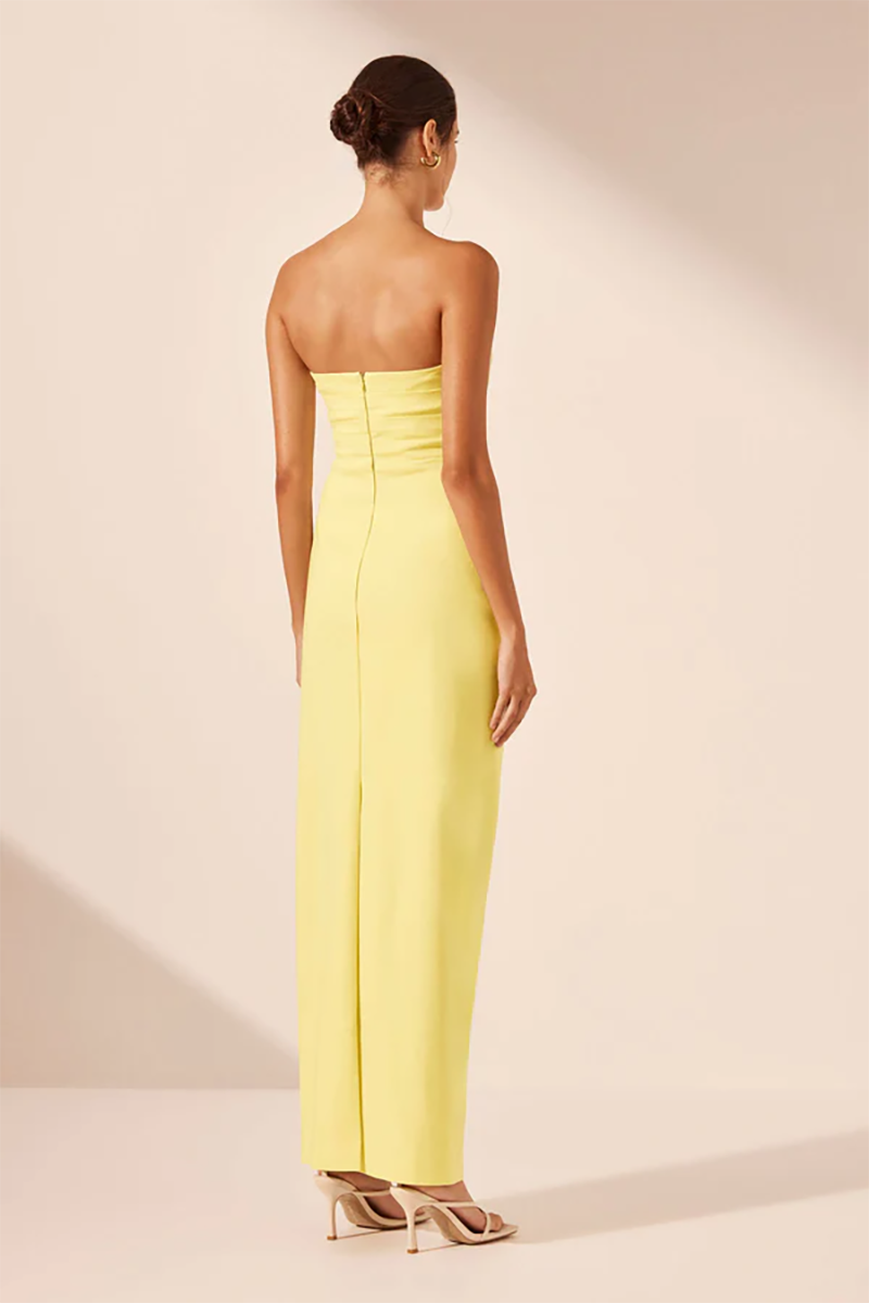 The Lani Strapless Draped maxi from Shona Joy is a gorgeous lemon rental. Crafted from a premium stretch cotton blend, this dress features a draped bodice with side tucks to create a stunning silhouette. The perfect dress to rent for weddings or special occasions, it falls into a lined pencil skirt for the ultimate sophisticated show-stopper.