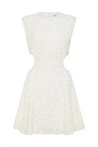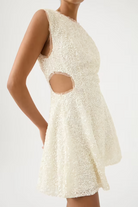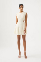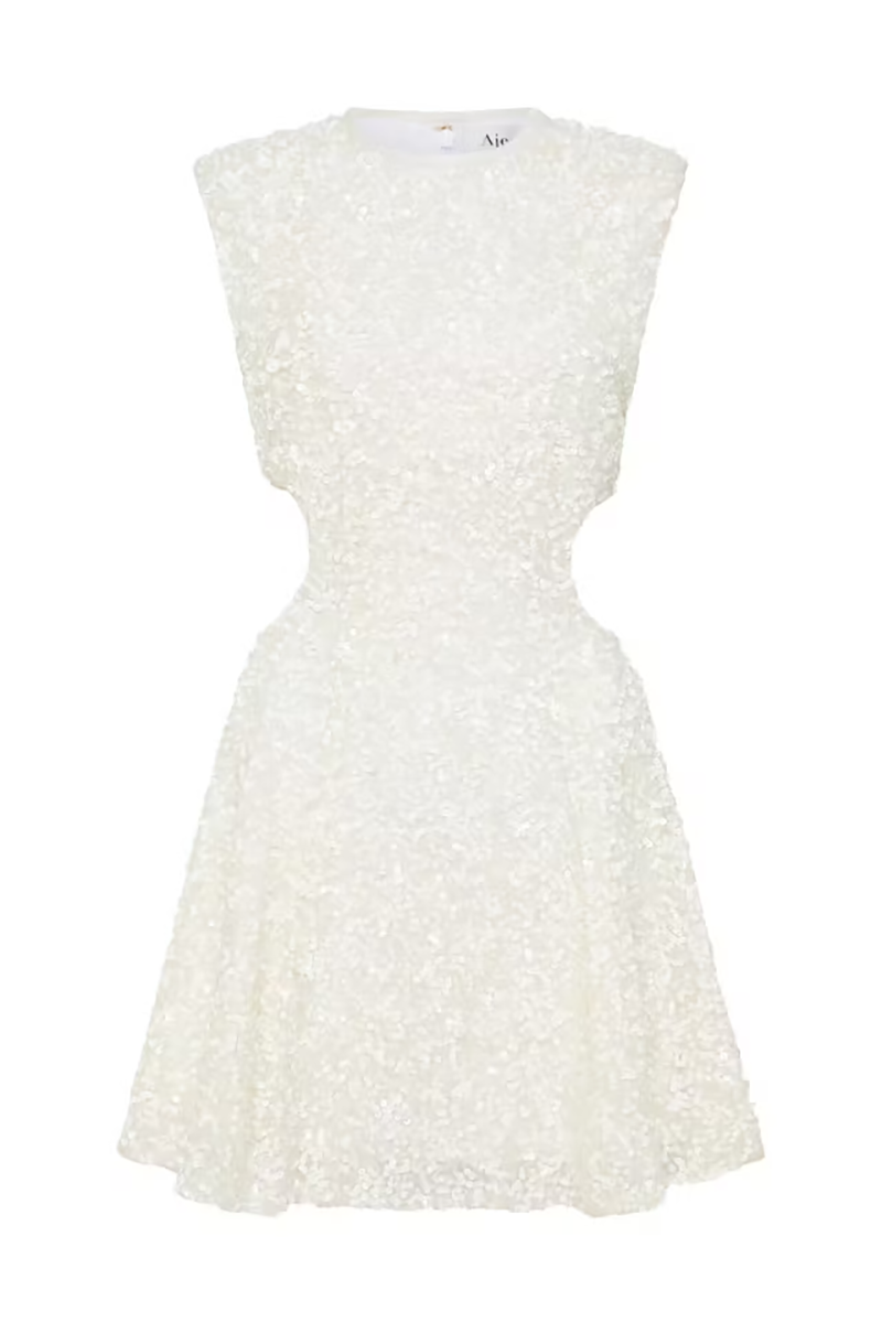 Make a statement in the Aje Mirage Beaded Mini Dress, a stunning fusion of modern elegance and playful charm. Designed with an A-line silhouette, this mini dress features a sleek crew neckline and sultry waist cut-outs, creating a bold yet sophisticated shape.