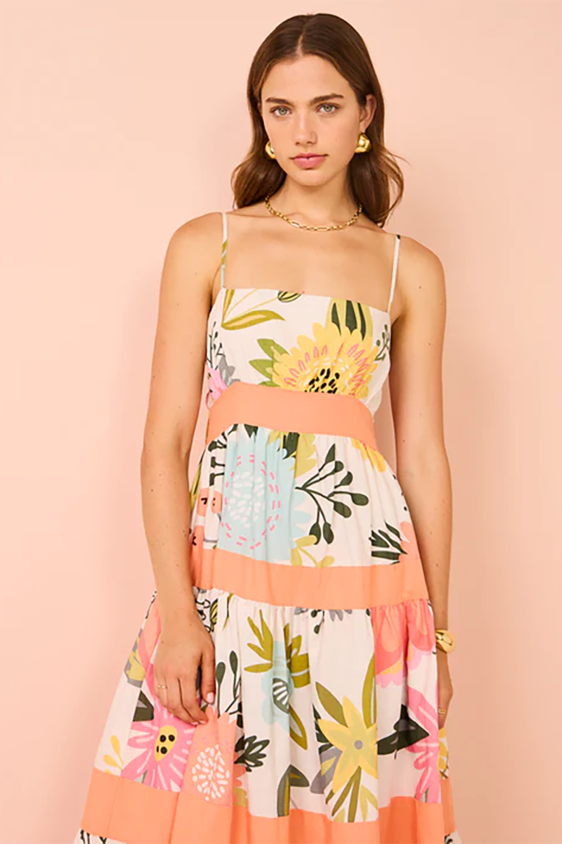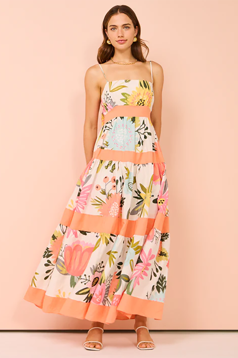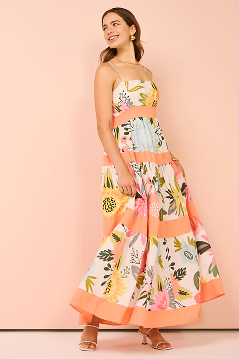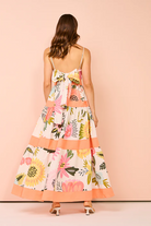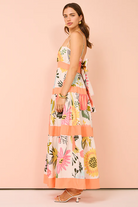 Sway through a season of celebrations with the By Nicola Monet Tiered Maxi Dress in Potpourri/Melon. Crafted from a cotton linen blend, this maxi dress features a strapless neckline, adjust straps with workable self fabric bow at the back and tiered maxi skirt. Admired for its sun-seeking print, this dress is perfect for summer days, cocktail evenings and garden parties.