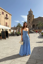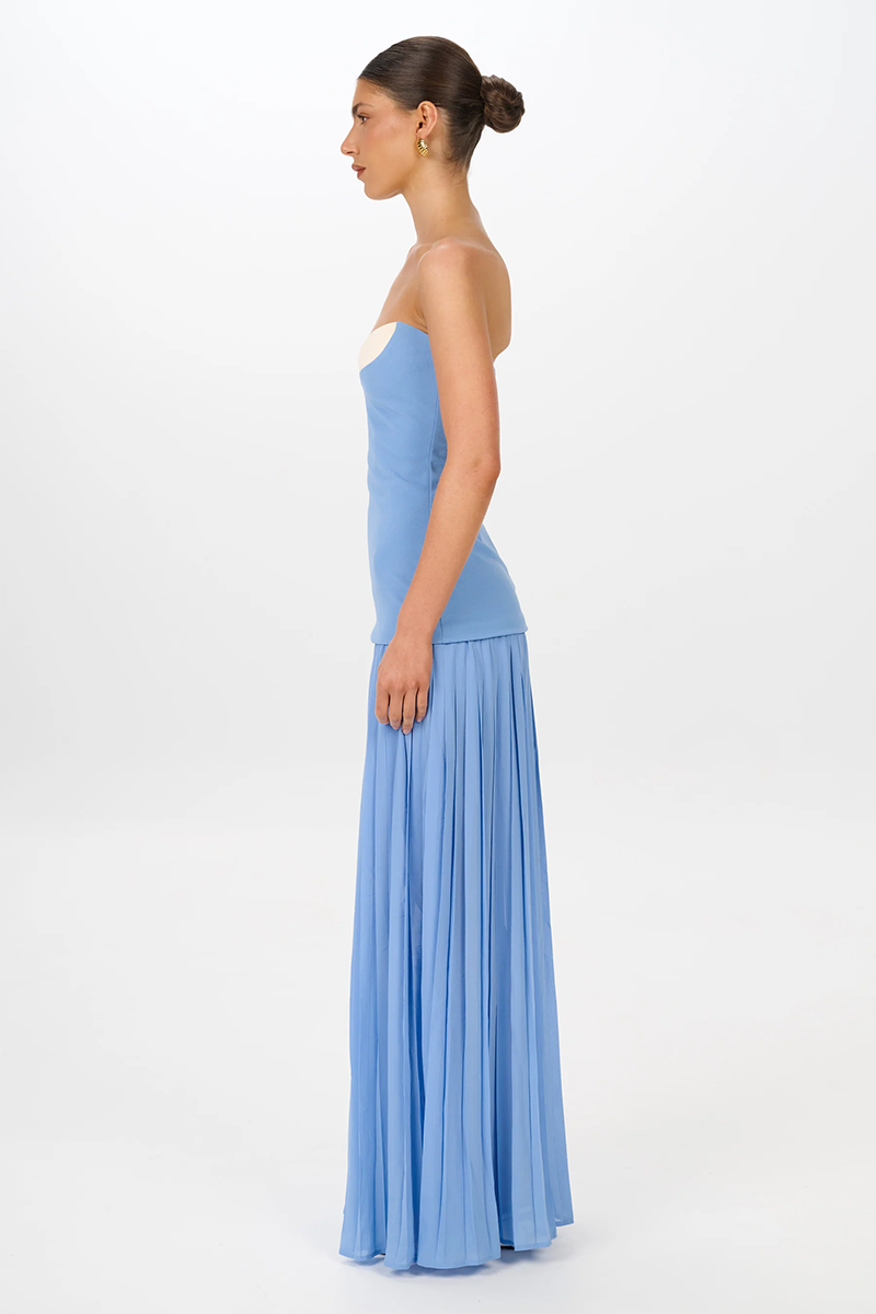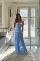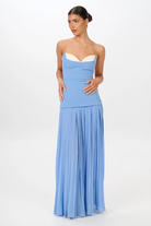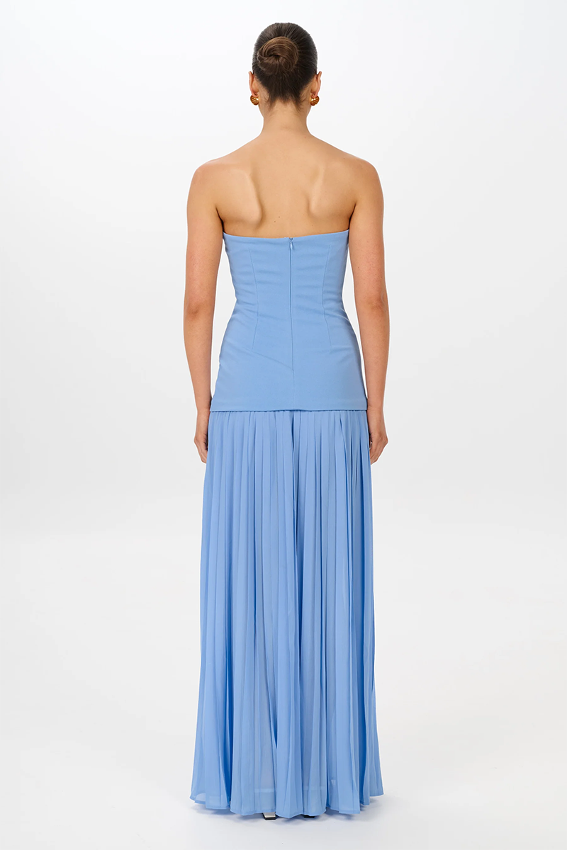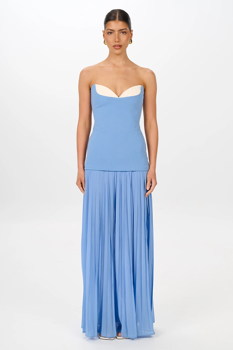 The Nicolette maxi dress showcases a stylish drop waist bodice that flows into a pleated fall skirt. Its gorgeous folded bodice design adds a touch of elegance and sophistication. Perfect for any occasion, this dress combines comfort with timeless beauty.