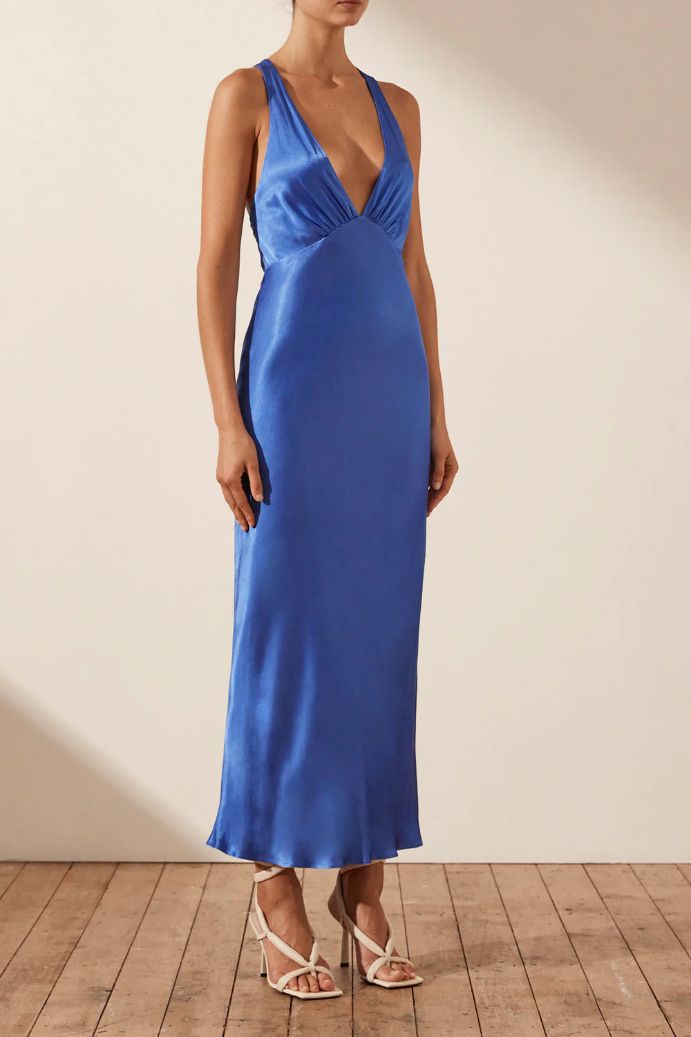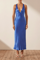 Crafted from a luxurious silk touch fabric, the Oliviera Plunged Cross Back Midi features an invisible back zip closure and a deep v-neckline with a cross-back detail. In a gorgeous electric blue, this dress is perfect to rent to carry you through wedding festivities, birthday celebrations and those special date-night occasions.
