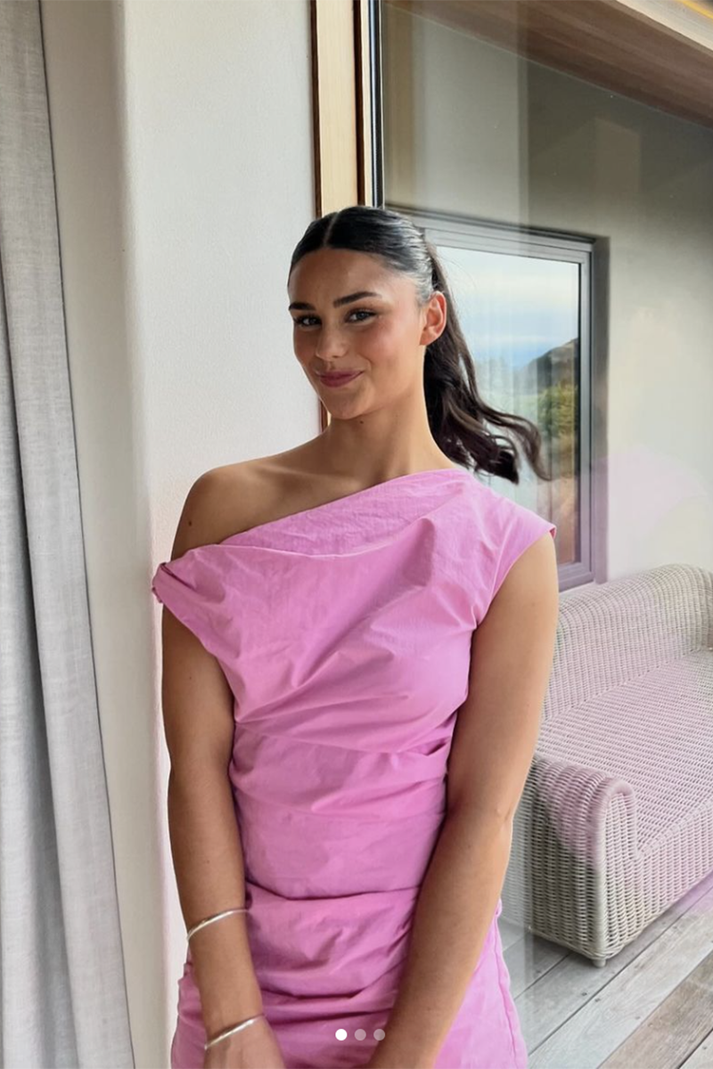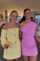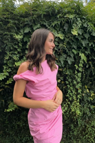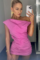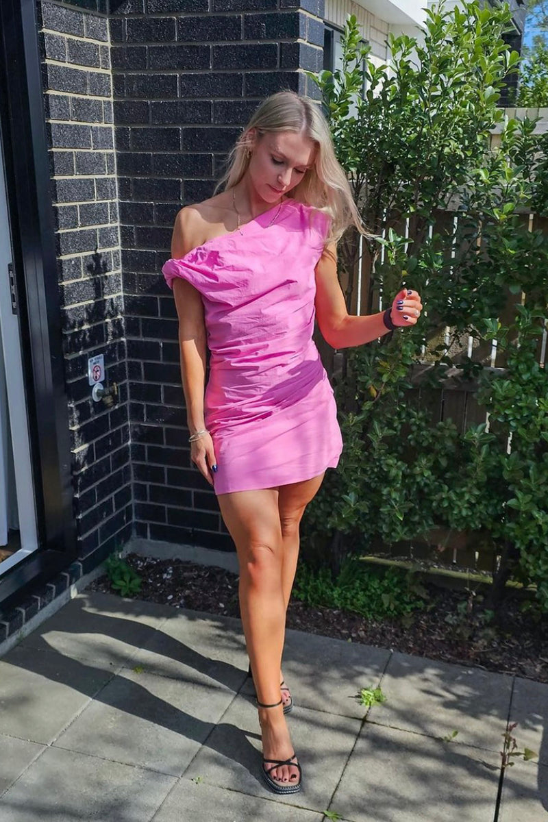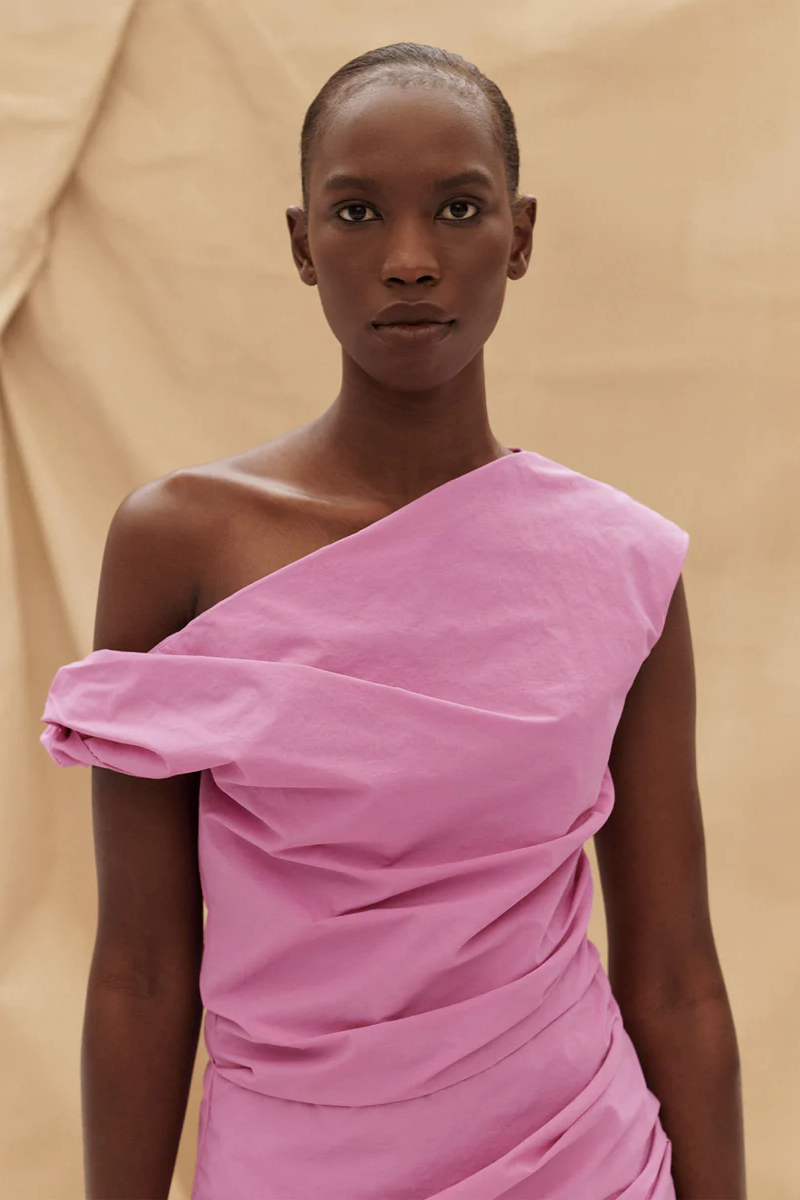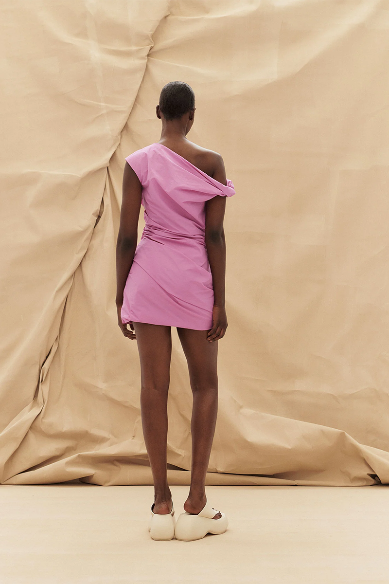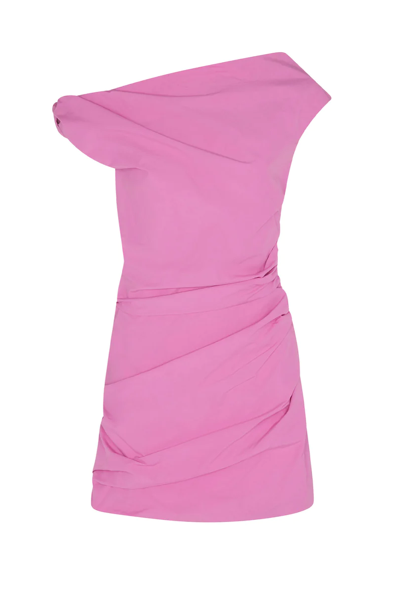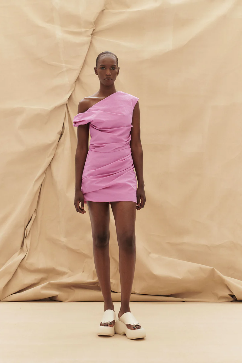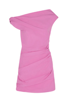 The Remmy mini is a gorgeous baby pink mini dress from NZ designer, Paris Georgia. Cut from a crisp cotton-blend poplin, it drapes from one shoulder with a structural shape that is sure to turn heads.